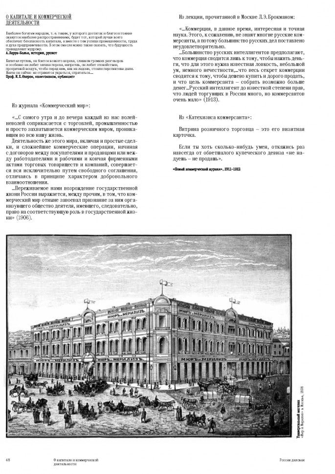 Необычное историко-популярное издание (путеводитель, справочник и альбом), в котором Время «оживает». Вторая половина XIX века – эпоха Великих реформ в России. Крепостное право становится историей, страна с огромными возможностями начинает движение по пути капиталистической модернизации своей экономики. В начале XX века Россия прочно утверждается на пятом месте в мире по абсолютным размерам промышленного производства.Обращаясь к многочисленным профильным источникам, заметное место среди которых занимает периодическая печать, И. Архангельская представляет наполненную событиями, фактами, цифрами картину экономической жизни старой России и знакомит читателя с ценным деловым опытом прошлого. Издание содержит две сотни иллюстраций; разного рода исторические и биографические справки; деловой словарь и «говорящую» газетно-журнальную хронику; образцы товарных знаков и рекламных объявлений; портреты и меткие характеристики преуспевших деловых людей, а также не утратившие актуальности мысли и суждения, почерпнутые из забытых книжных и периодических изданий.
