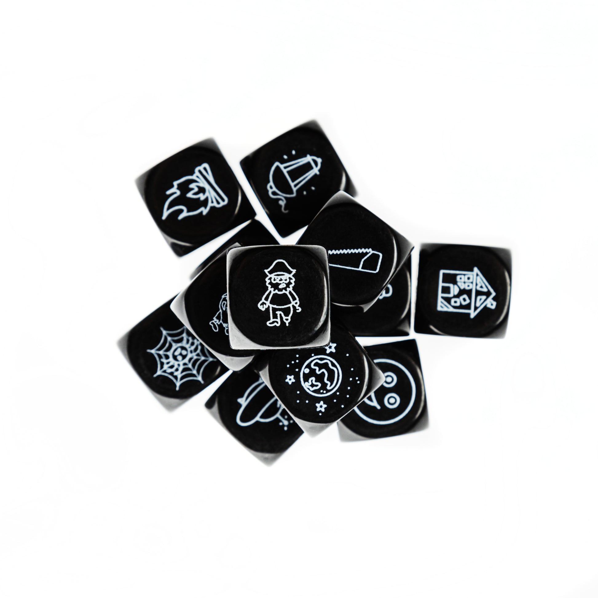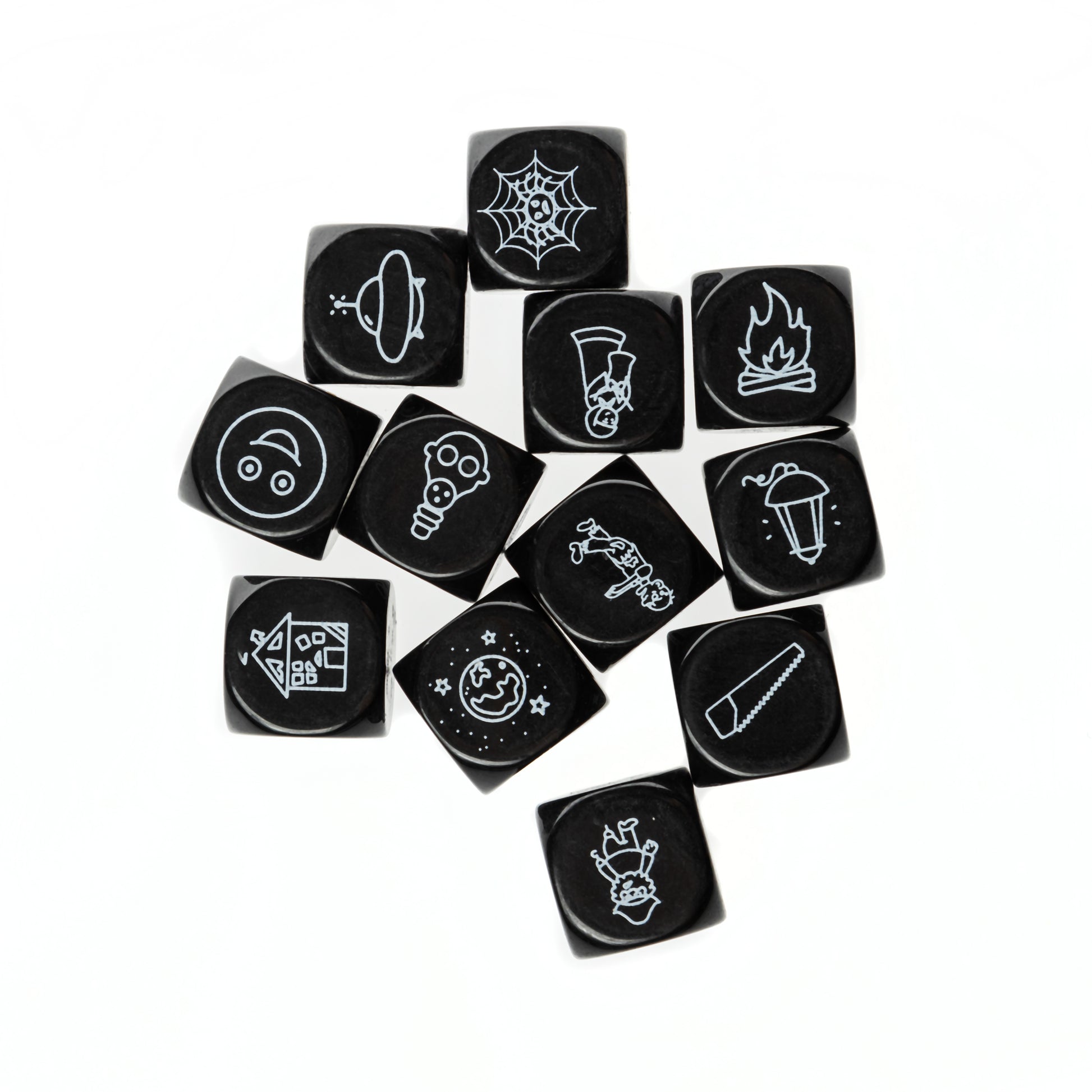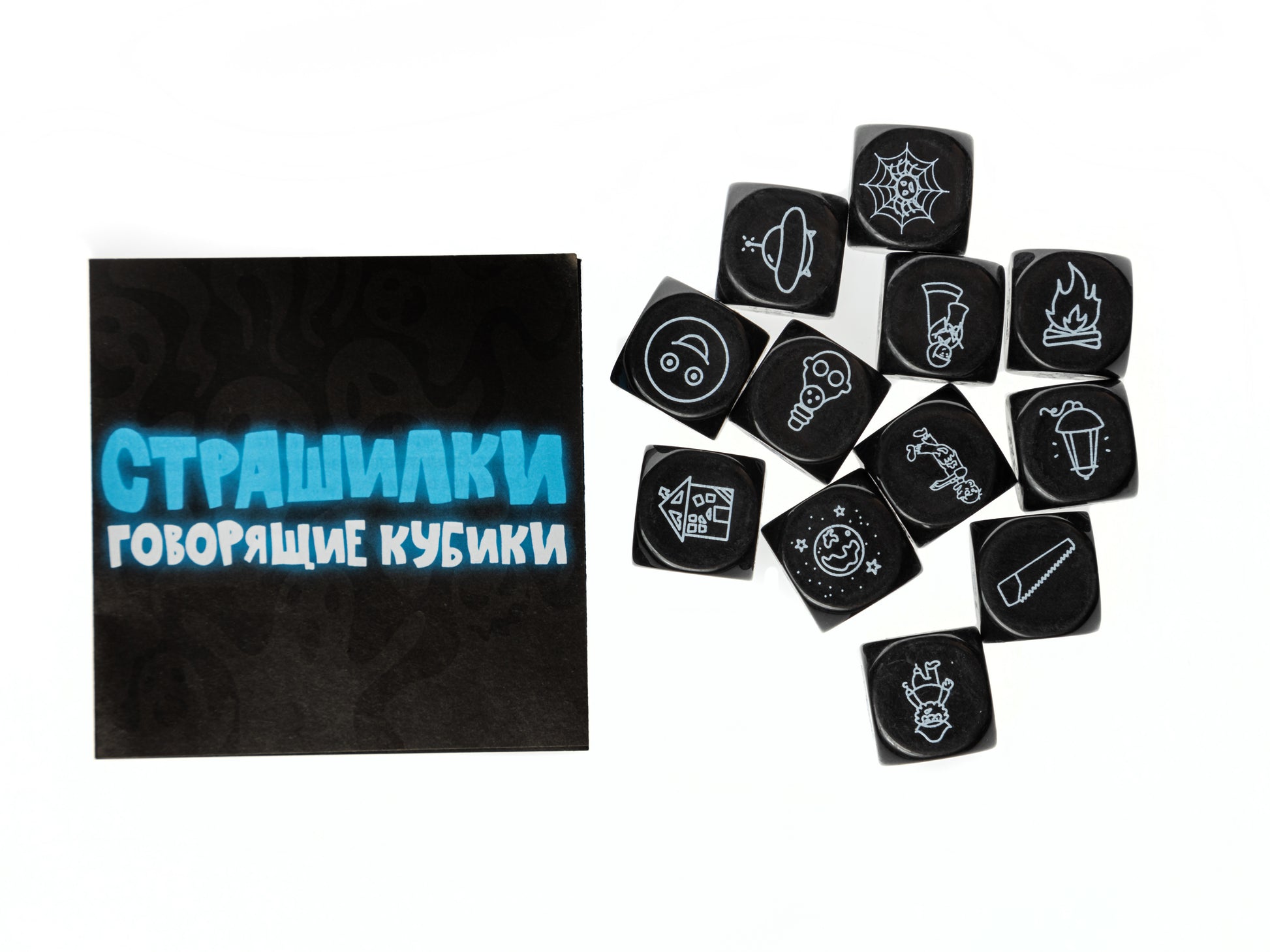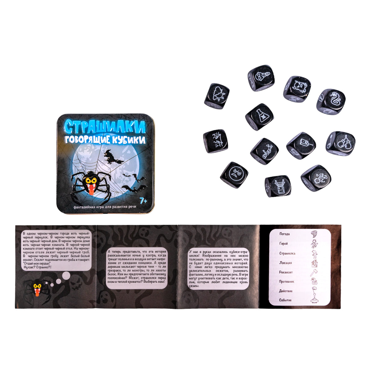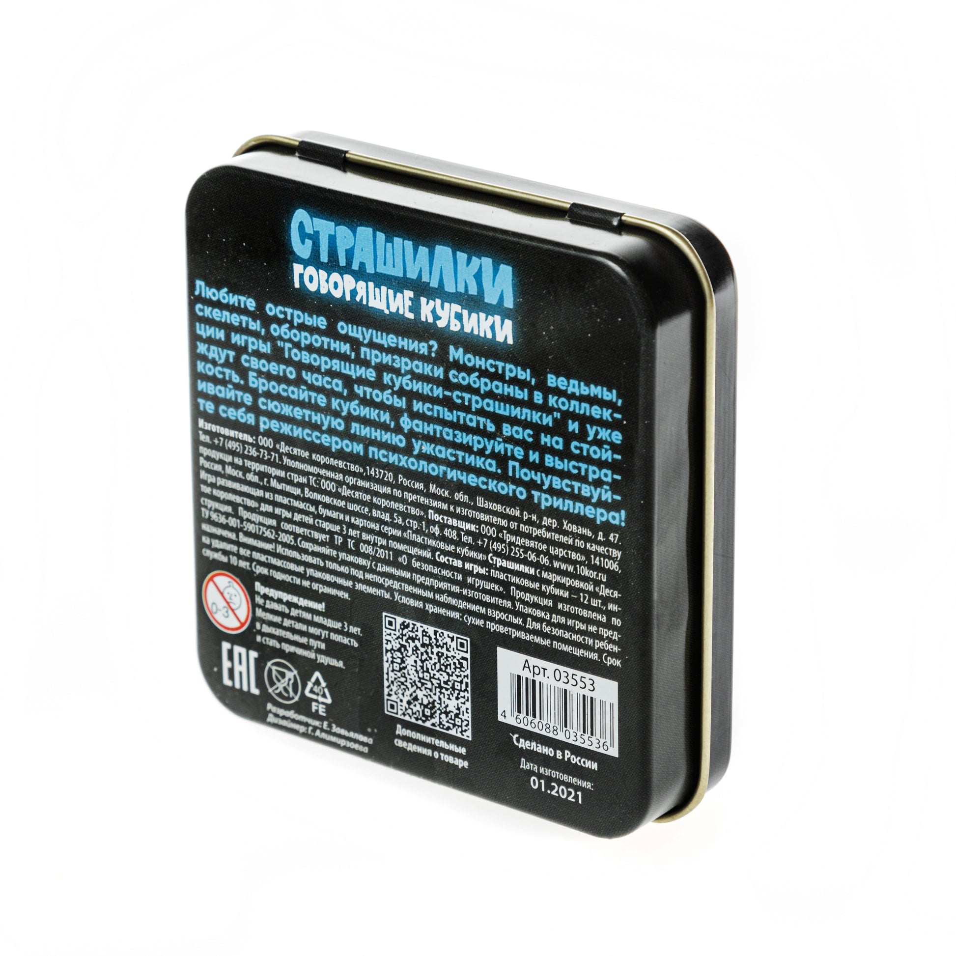 Handling time: 24 days Настольная игра «Говорящие кубики Страшилки» (серия «Игры в табакерке»). Состав: пластиковые кубики – 12 шт. (18 х 18 мм), инструкция. Материал: пластик, бумага. Для детей от 7 лет. Развивает фантазию, воображение, логическое мышление, память, речь и способность вести последовательный рассказ.