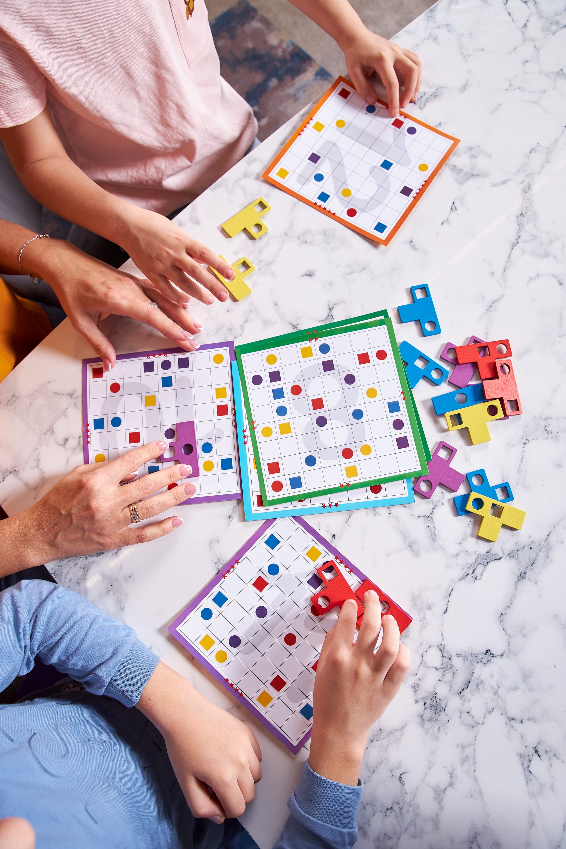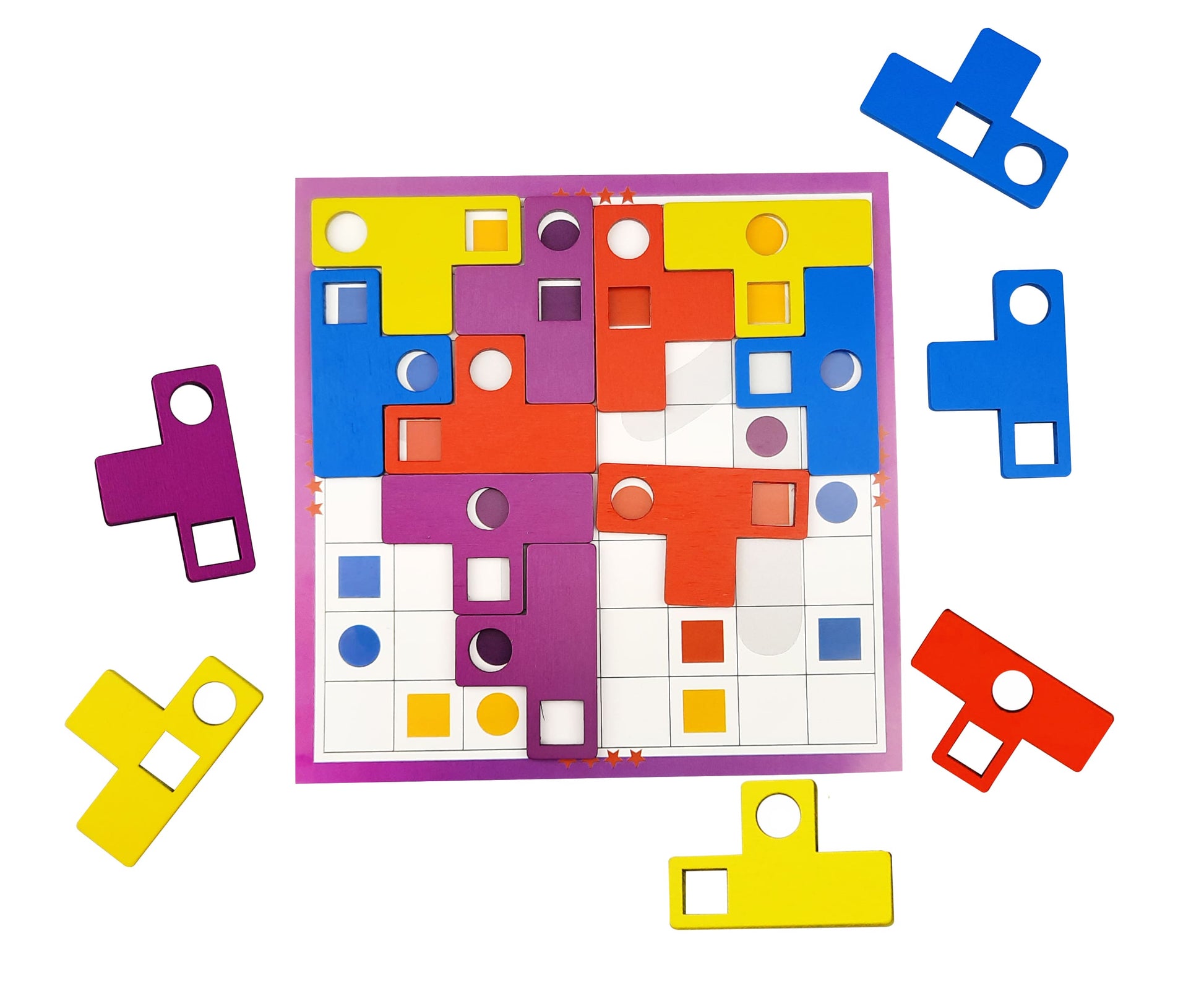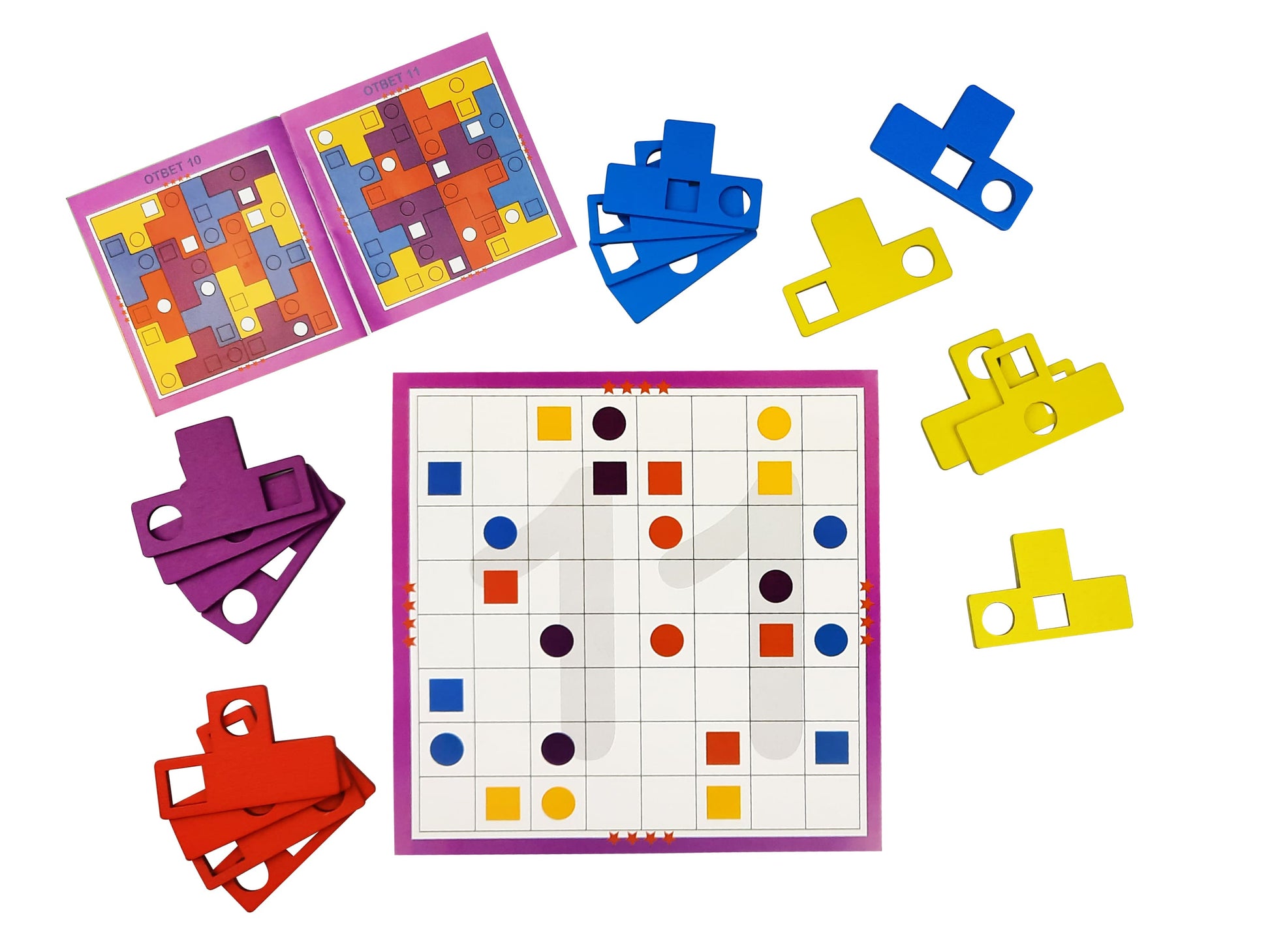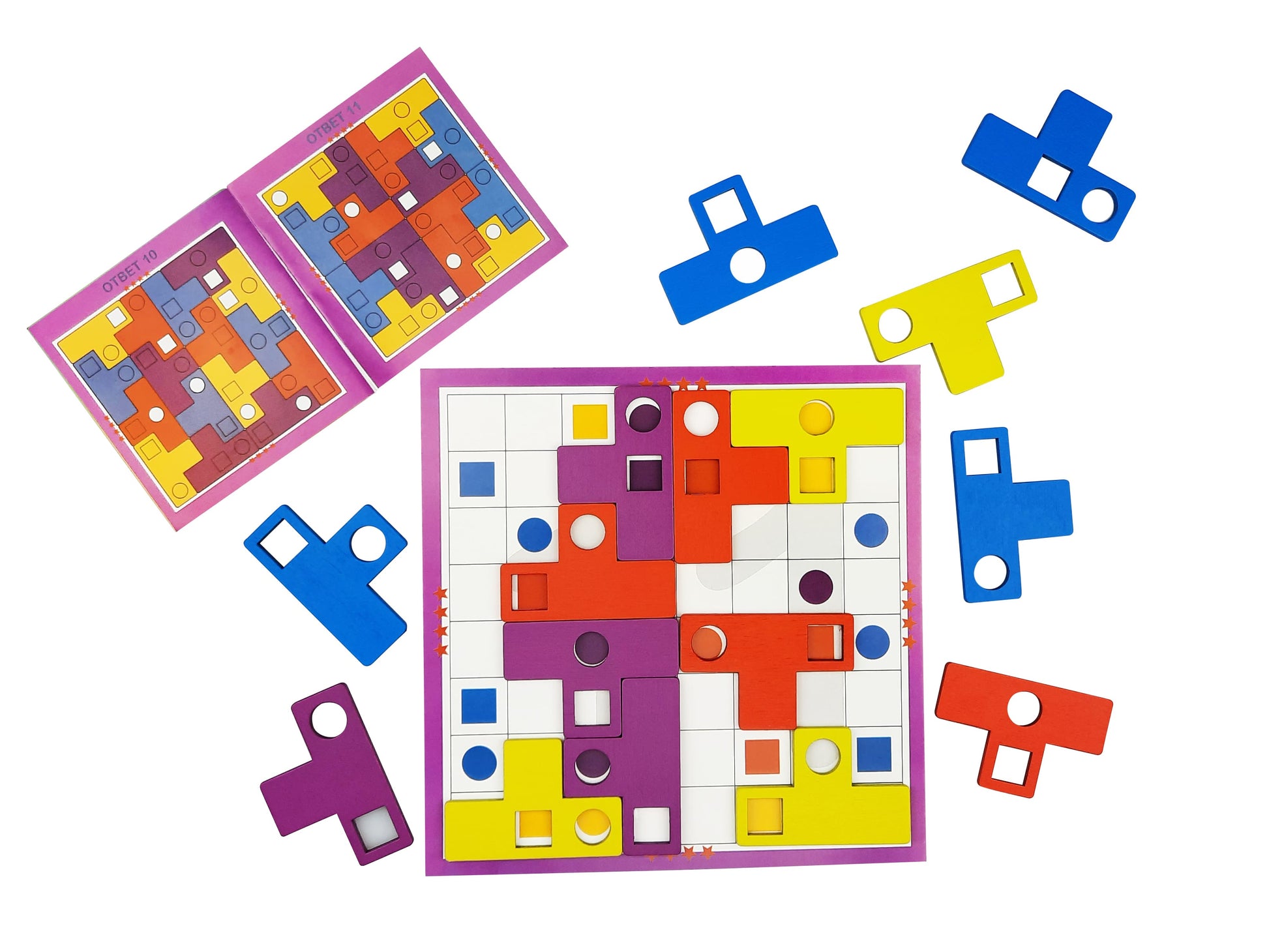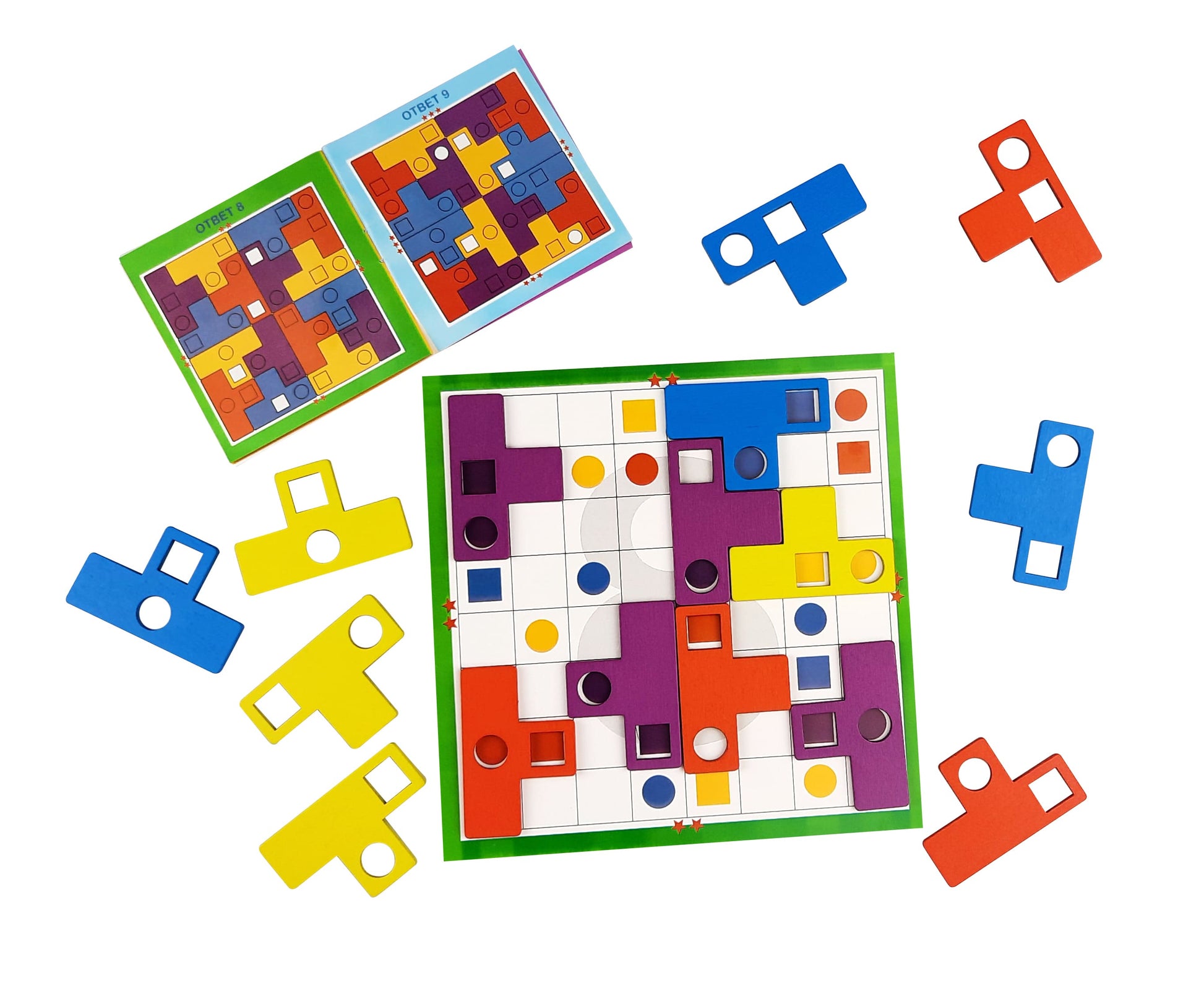 Веселые и познавательные игрушки-головоломки по праву входят в список лучших игр для детей, особенно из-за множества преимуществ, которые они приносят ребенку. Доказано, что головоломки помогают ребенку более эффективно развивать концентрацию и память.Чем лучше ребенок научится разгадывать головоломки, тем больше приобретает базовых навыков обучения, таких как внимание к деталям и решению проблем.Состав игры:• деревянные фишки - 16 шт (3,8 х 5,7 см);• двухсторонние карточки с заданиями разного уровня сложности - 6 шт (16,5 х 16,5 см, всего 12 заданий);• инструкция с правилами и ответами - 1 шт.Игра рекомендована для детей от 5 лет.Как играть?Цель игры «Занимательный Квадрат», это заполнение корточек Т-образными фишками при соблюдении соответствия значков на карточках (круглых и квадратных) с цветом укладываемых деталей.В состав игры входят 6 двухсторонних карточек с 12 заданиями разного уровня сложности по принципу от простого к сложному. Каждая карточка помечена цифрами от 1 до 12. Ответы помечены цифрами, соответствующими заданиям.Первый уровень - самый простой и позволяет игроку понять принцип головоломки, познакомиться с ее решением.С повышением сложности заданий количество цветных значков на карточках уменьшается, поэтому часть отверстий карточек останутся пустыми.Решение заданий способствует развитию внимания, памяти, пространственного и логического мышления. А ещё ребёнок потренирует усидчивость и навык самостоятельного решения задач.