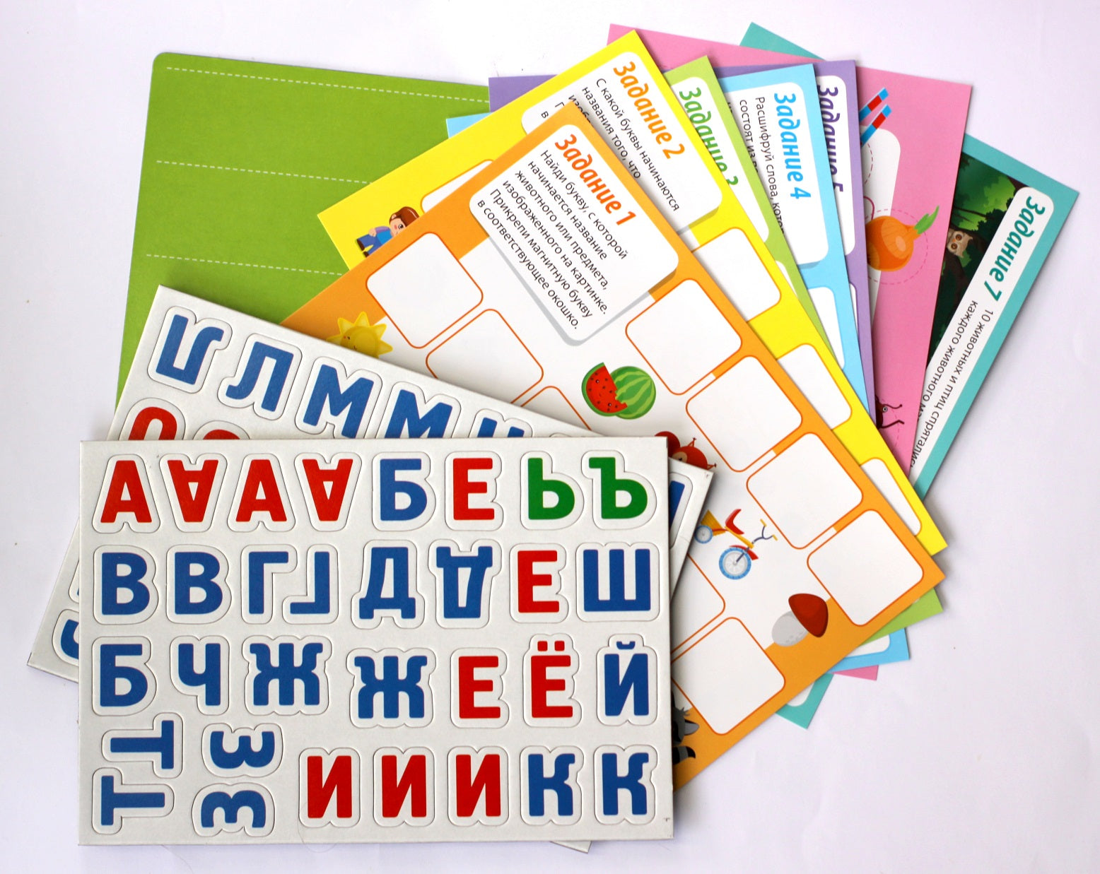 Handling time: 24 days Магнитная обучающая игра «Азбука с заданиями» для детей от 3 лет. Состав игры: двухстороннее магнитное игровое поле (23,5 х 14,7 см), карточки с заданиями – 8 шт. (22,5 х 13,7 см), магнитные буквы – 62 шт. (высота – 3 см). Материалы: магнит, магнитомягкое железо, картон. Для детей старше 3 лет. Для 1 игрока.