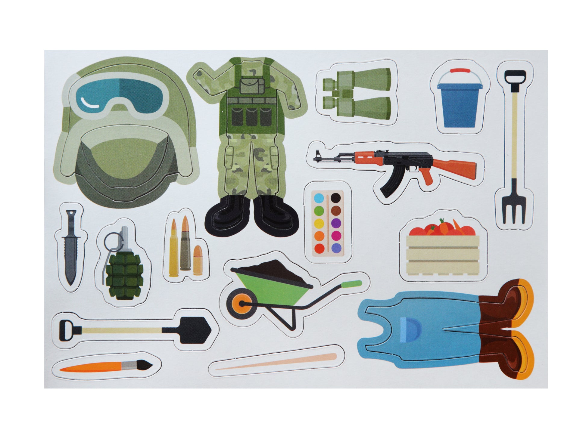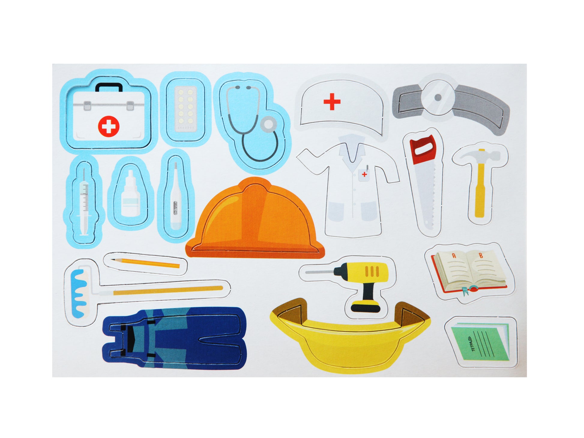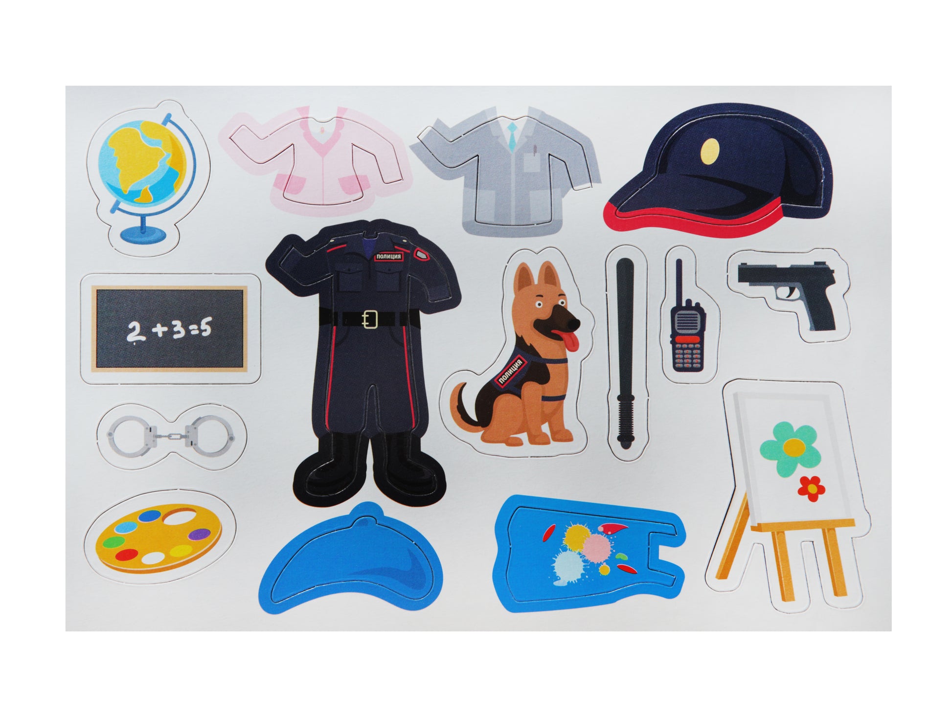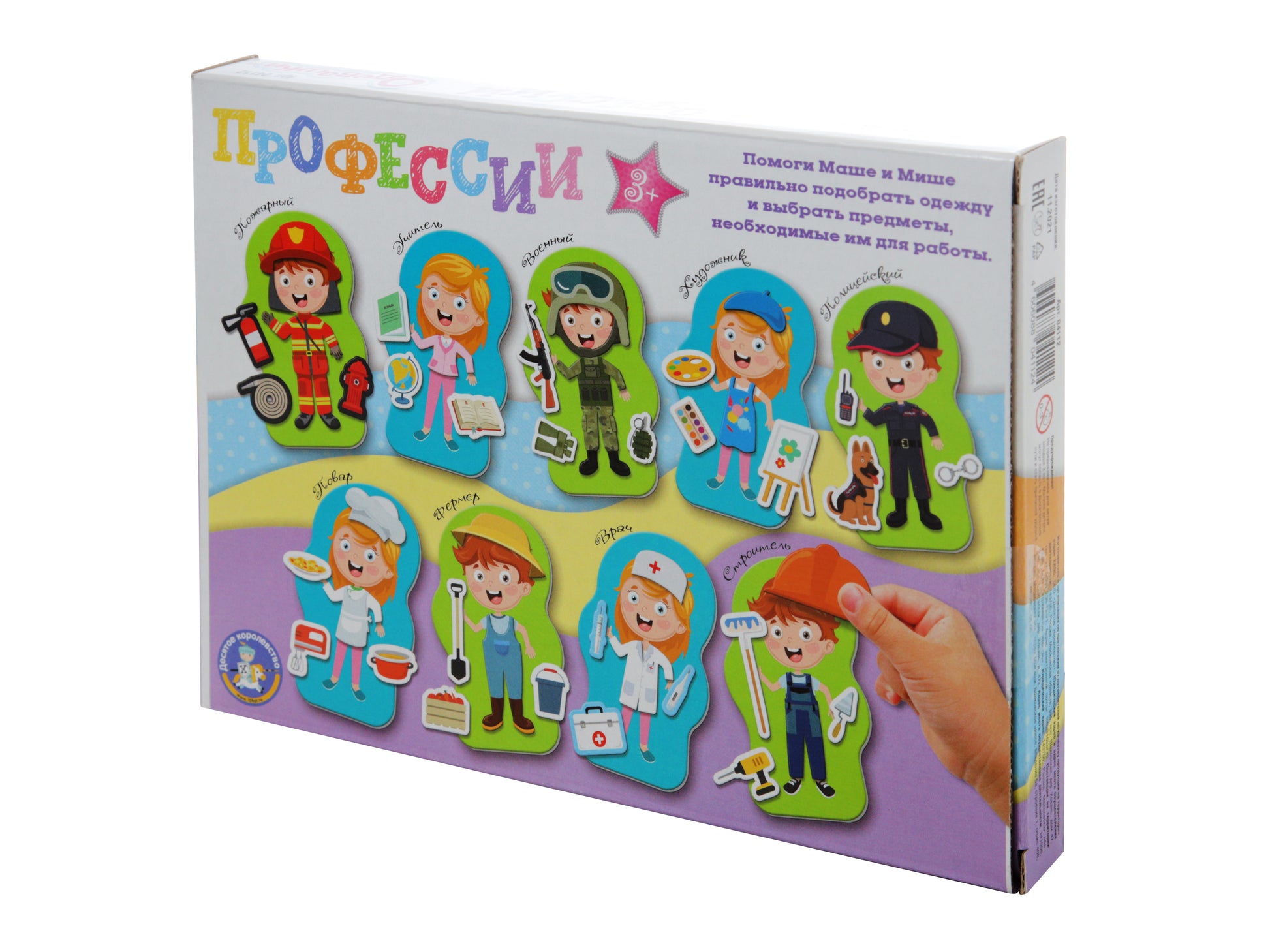 Handling time: 24 days Магнитная игра "Одевашки. Профессии" из серии "Магнитные истории" познакомит вашего ребёнка с различными профессиями, а также научит правильно подбирать одежду и предметы, необходимые каждому специалисту по работе.Состав игры:- фигурка-основа - 2 шт. (14,5 х 8,5 см)- магнитные элементы (одежда) - 66 шт.Игра предназначена для детей от 3 лет.Как играть?Задача игры - научиться различать представителей разных профессий друг от друга, подбирать им соответствующую их работе одежду и необходимые атрибуты.В комплект набора входят две фигурки персонажей (Маша и Миша) и 4 листа магнитных элементов (одежды и предметов), благодаря которым наши герои будут преображаться в пожарного, учителя, художника, повара, военного, полицейского, врача, фермера и строителя.Фигурки-основы выполнены из мягкого железа, покрытого картоном с двух сторон (лицевая сторона ламинирована). Одежда из магнитного винила легко фиксируется на фигурках.Игра входит в состав серии "Магнитные истории", где мы собрали магнитные игры с разнообразными сюжетами.Магнитная игра "Одевашки. Профессии" развивает фантазию, логику и внимательность, а также учит различать профессии по предметам одежды и атрибутике.Сделано в России.