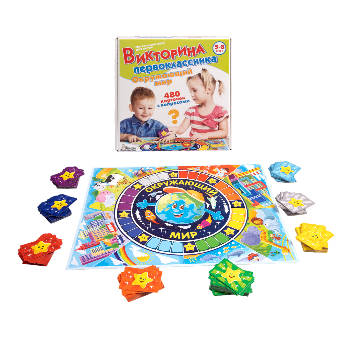 Handling time: 24 days Сыграйте в игру «Викторина первоклассника. Окружающий мир» и оцените знания своего ребенка и его подготовку к школе!Состав:• игровое поле (42х33 см)• игральный кубик• разноцветные фишки – 6 шт.• карточки – 480 шт.• правила игрыИгра рассчитана на 2-6 игроков в возрасте от 5 до 8 лет. Участие взрослого в игре обязательно! Игра имеет два варианта игры, что позволяет использовать ее как дома, так и в дошкольных образовательных учреждениях.Викторина развивает у детей любознательность, расширяет кругозор и помогает повысить школьную успеваемость.Посмотрите другие викторины от «Десятого королевства» на нашем сайте .