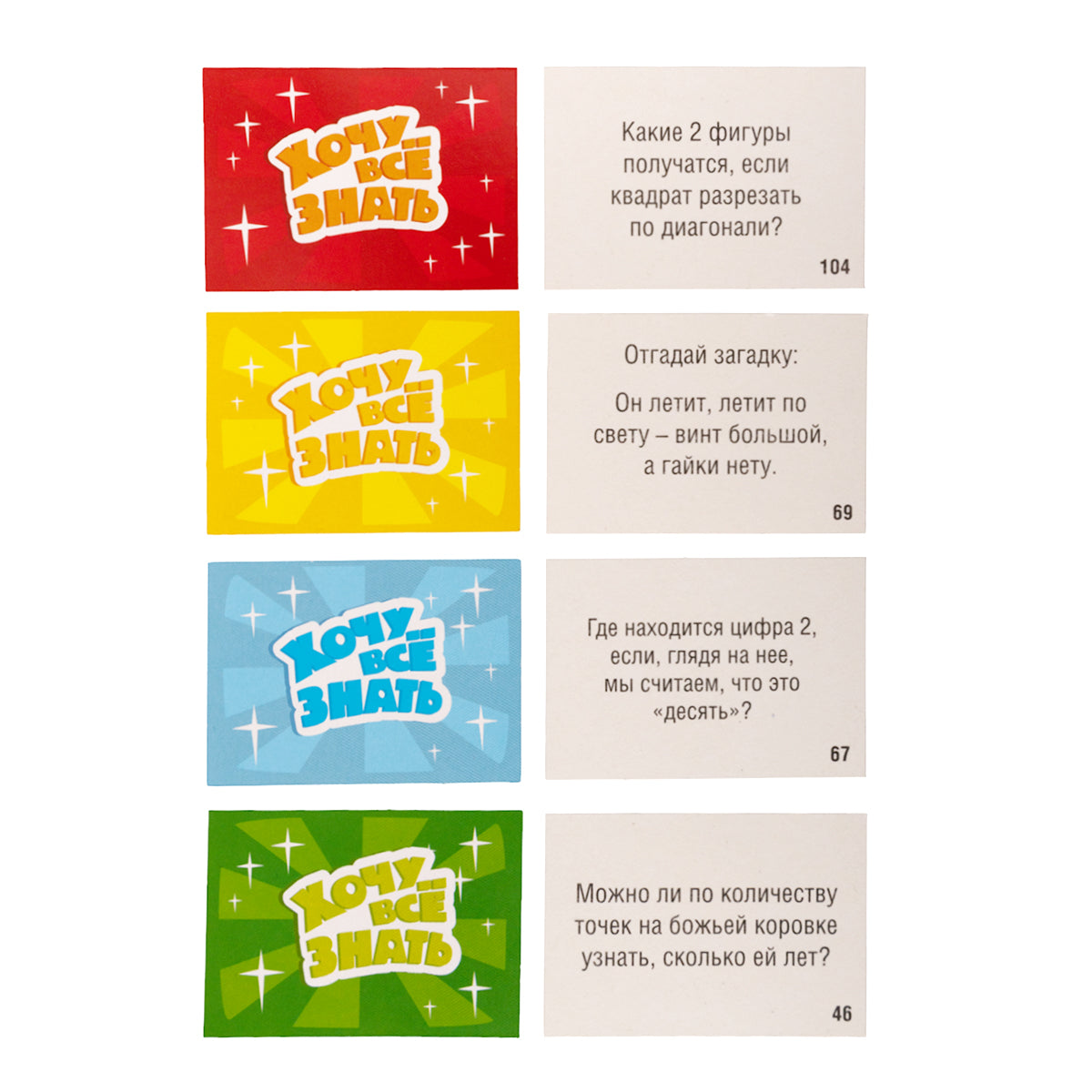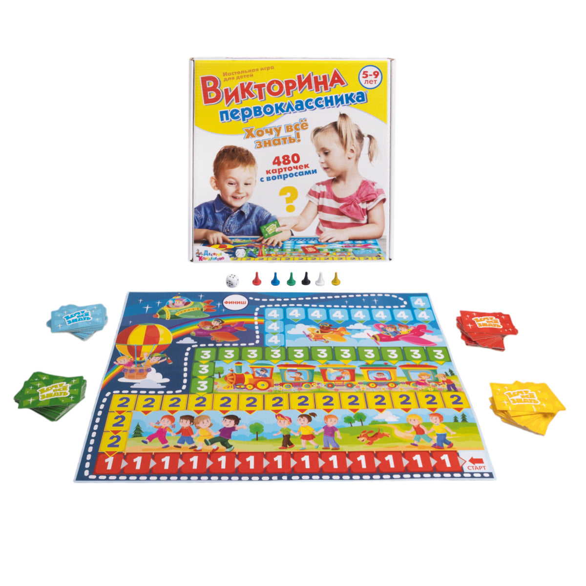 Handling time: 24 days Сыграйте в игру «Викторина первоклассника. Хочу всё знать» и выясните, какими знаниями уже обладает ваш ребёнок, умеет ли ими пользоваться и решать нестандартные задачи!Состав:• игровое поле (42х33 см)• игральный кубик• разноцветные фишки – 6 шт.• карточки – 480 шт.• правила игрыИгра рассчитана на 2-6 игроков в возрасте от 5 до 9 лет. Участие взрослого в игре обязательно! Игра имеет два варианта игры, что позволяет использовать ее как дома, так и в дошкольных образовательных учреждениях.Викторина развивает у детей любознательность, расширяет кругозор и помогает повысить школьную успеваемость.Посмотрите другие викторины от «Десятого королевства» на нашем сайте .