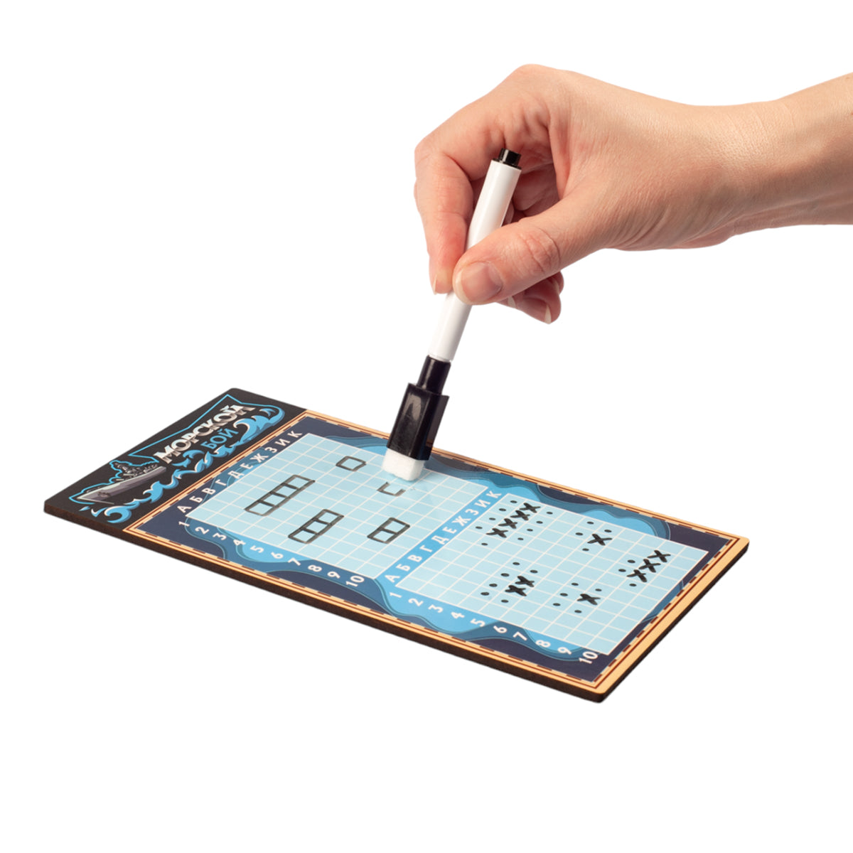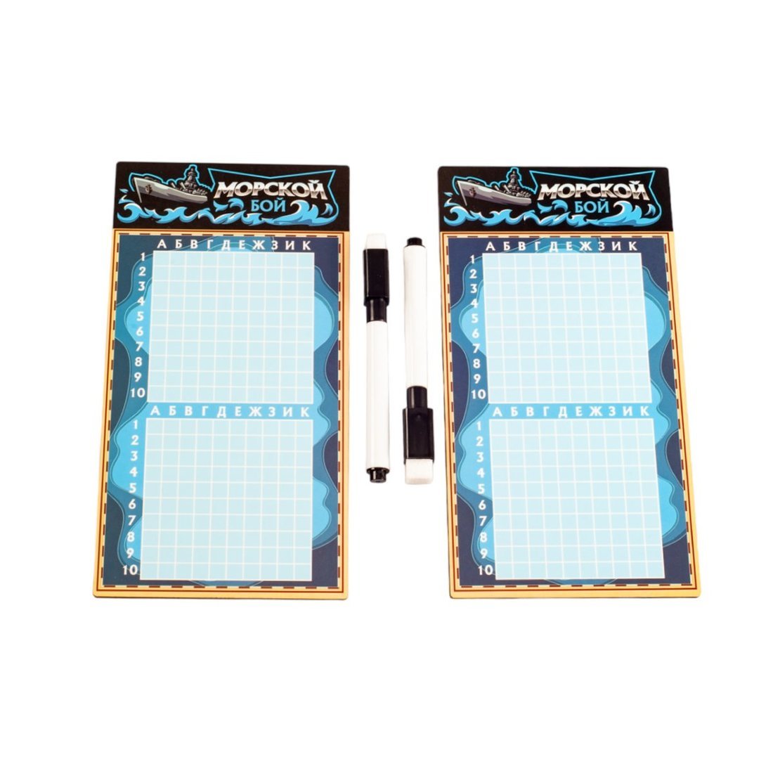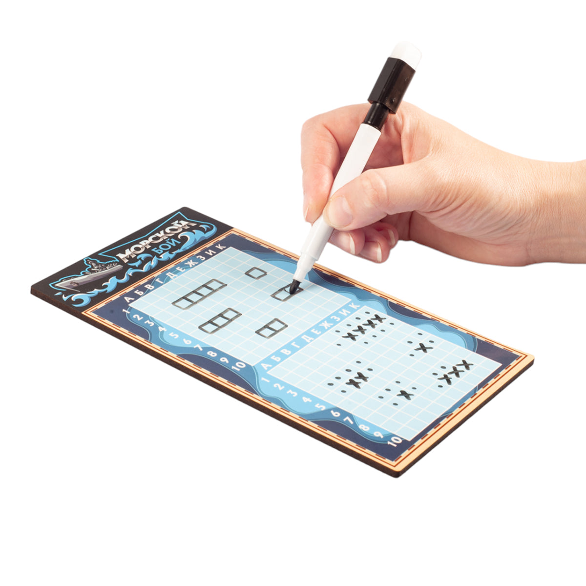 Handling time: 24 days Игра настольная «Морской бой» в пакете с маркерами. Состав игры: игровые поля из древесного материала - 2 шт. (10,5х20 см), маркер на водной основе - 2 шт.Материалы: древесный материал, бумага, полимерный материал.Игра рекомендована для детей старше 7-ми лет и взрослых.