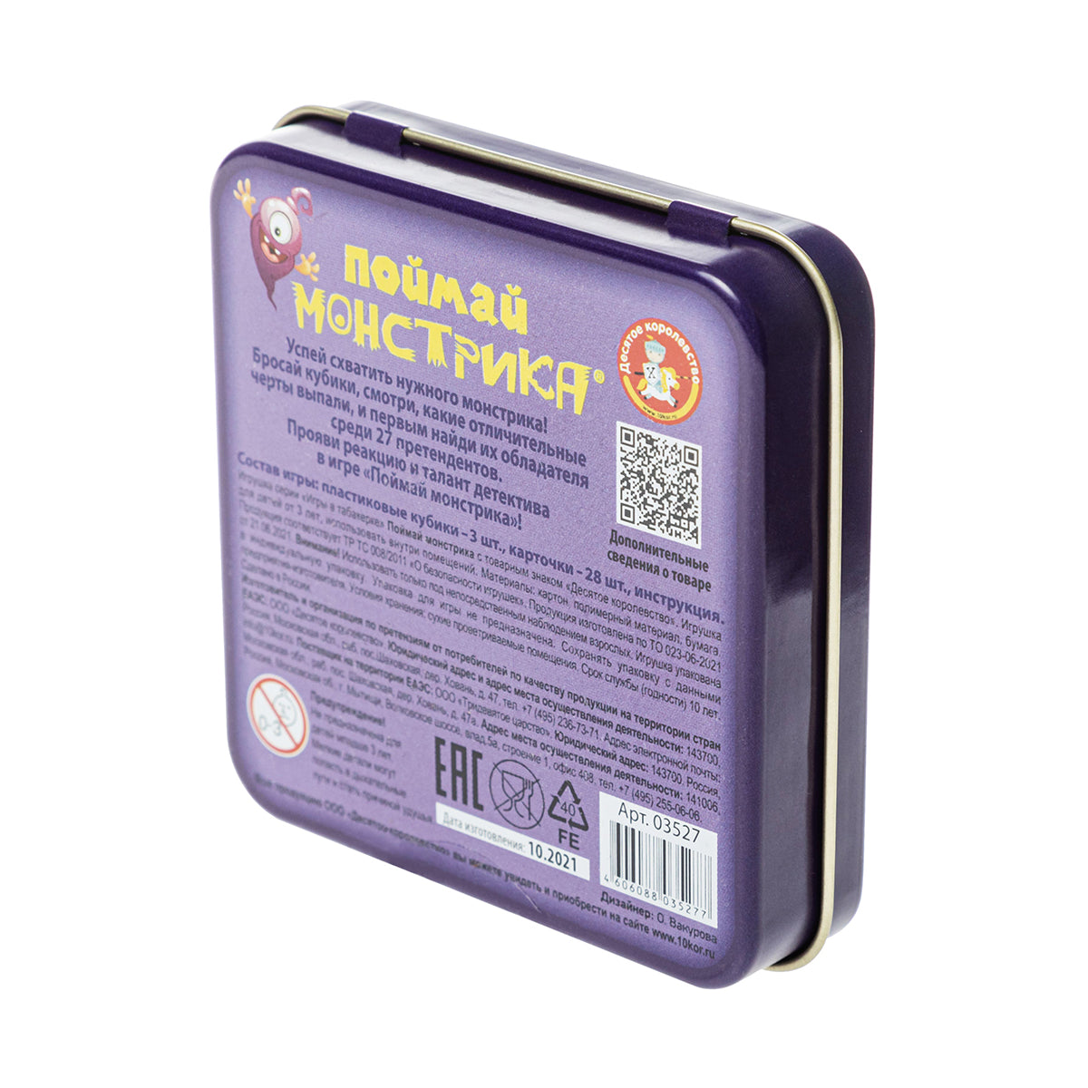 Handling time: 24 days Успей схватить нужного монстрика! Бросай кубики, смотри, какие отличительные черты выпали, и первым найди их обладателя среди 27 претендентов.Каждый Монстрик - индивидуален. Они отличаются количеством глаз, ног и наличием рук, рогов или ушей. Для того, чтобы понять, кого из Монстриков нужно поймать, игроки бросают кубики: кубики "ГЛАЗА" и "НОГИ" определят количество глаз и ног, а кубик "РУКИ-РОГА-УШИ" укажет на дополнительную опознавательную черту Монстрика. Задача игрока - первым найти Монстрика с подходящими свойствами и схватить его.У игры есть 3 варианта. Игра "Поймай монстрика" тренирует внимание, логику и реакцию и подойдет для досуга детей от 5 лет и взрослых.Состав игры: пластиковые кубики - 3 штуки, карточки - 28 штук, инструкция.Не рекомендуется детям до 3-х лет. Содержит мелкие детали.Сделано в России.