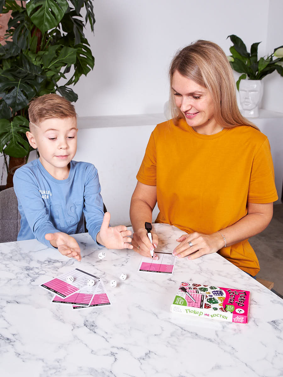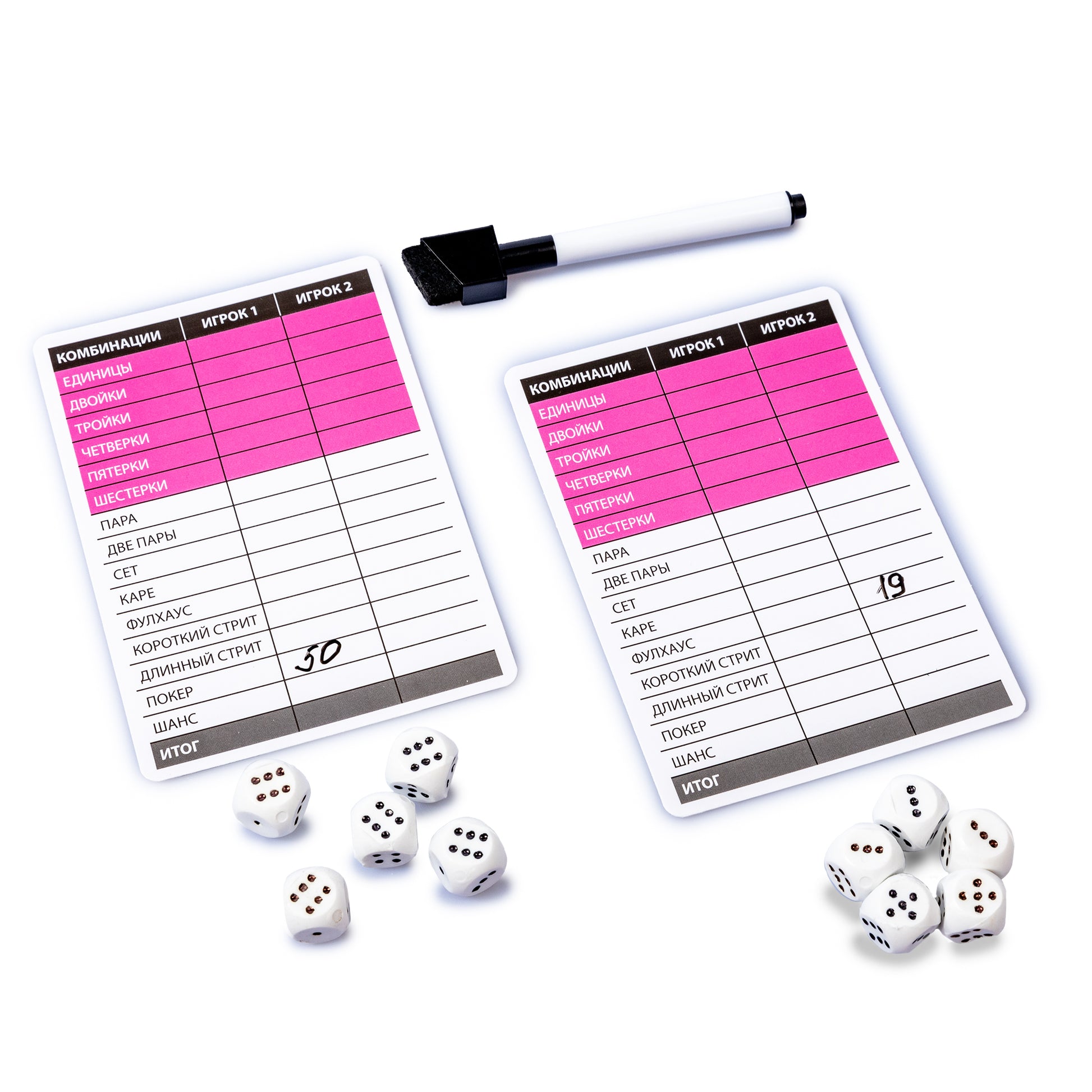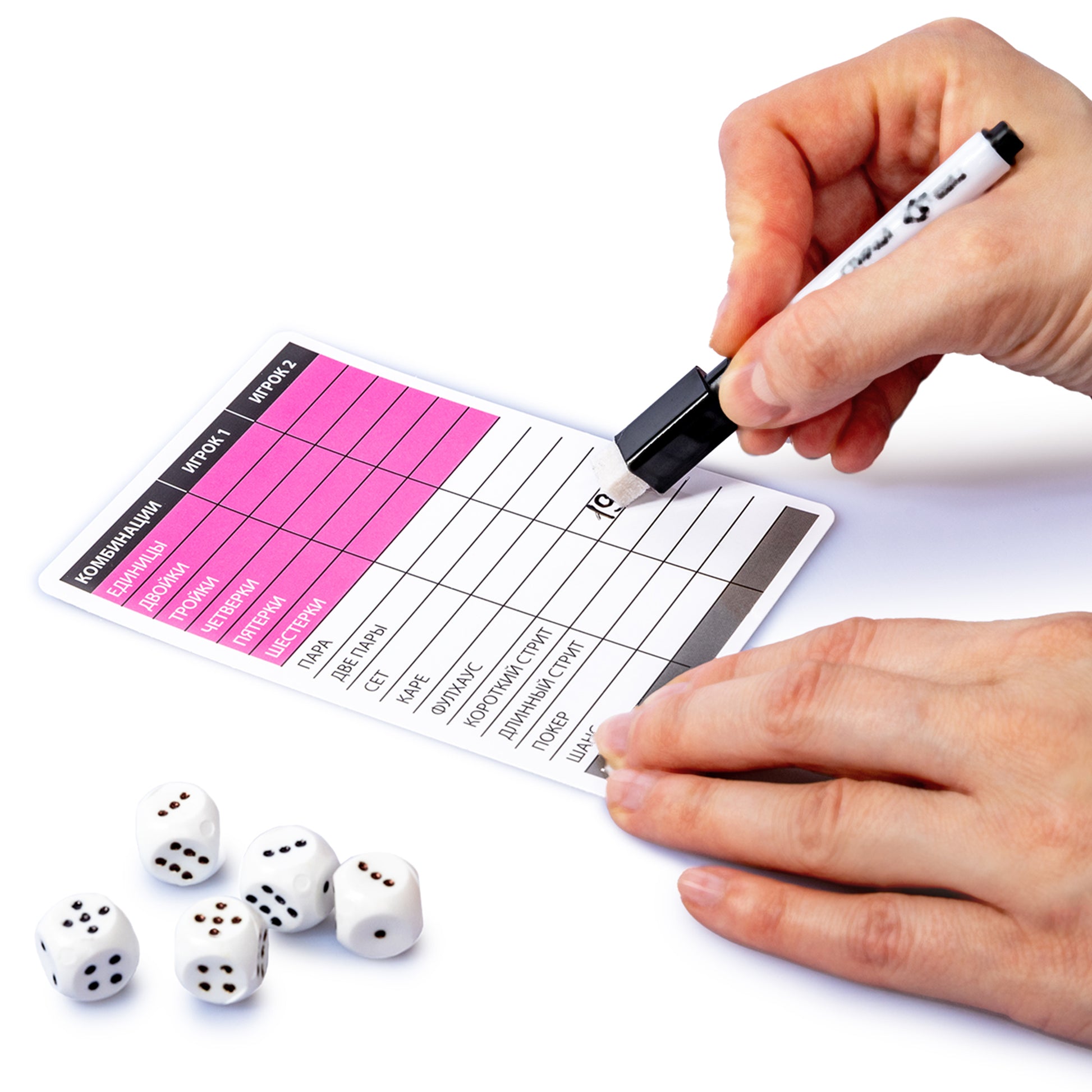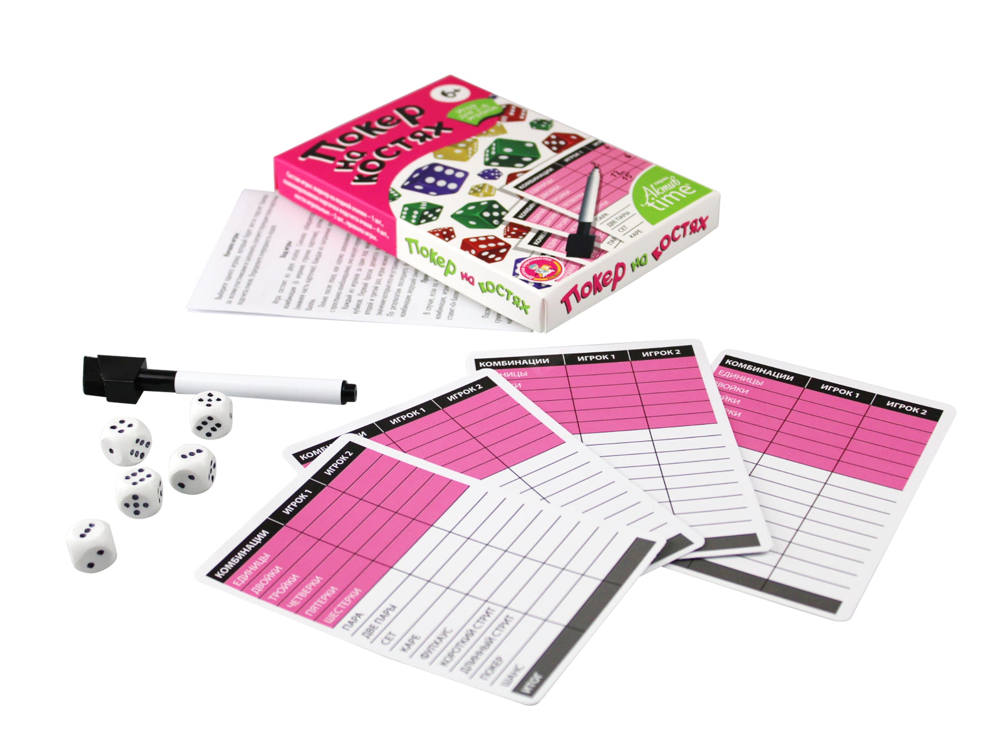 Handling time: 24 days Покер на костях. Состав маркер на водной основе – 1 шт., ламинированная карточка для подсчета очков – 4 шт. (10х14 см.), кости игральные – 5 шт., правила игры – 1 шт.Материал: картон, полимерный материал. Для детей от 6 лет. Покер на костях является отличным тренажёром для развития внимания, логического мышления и навыков устного счета.