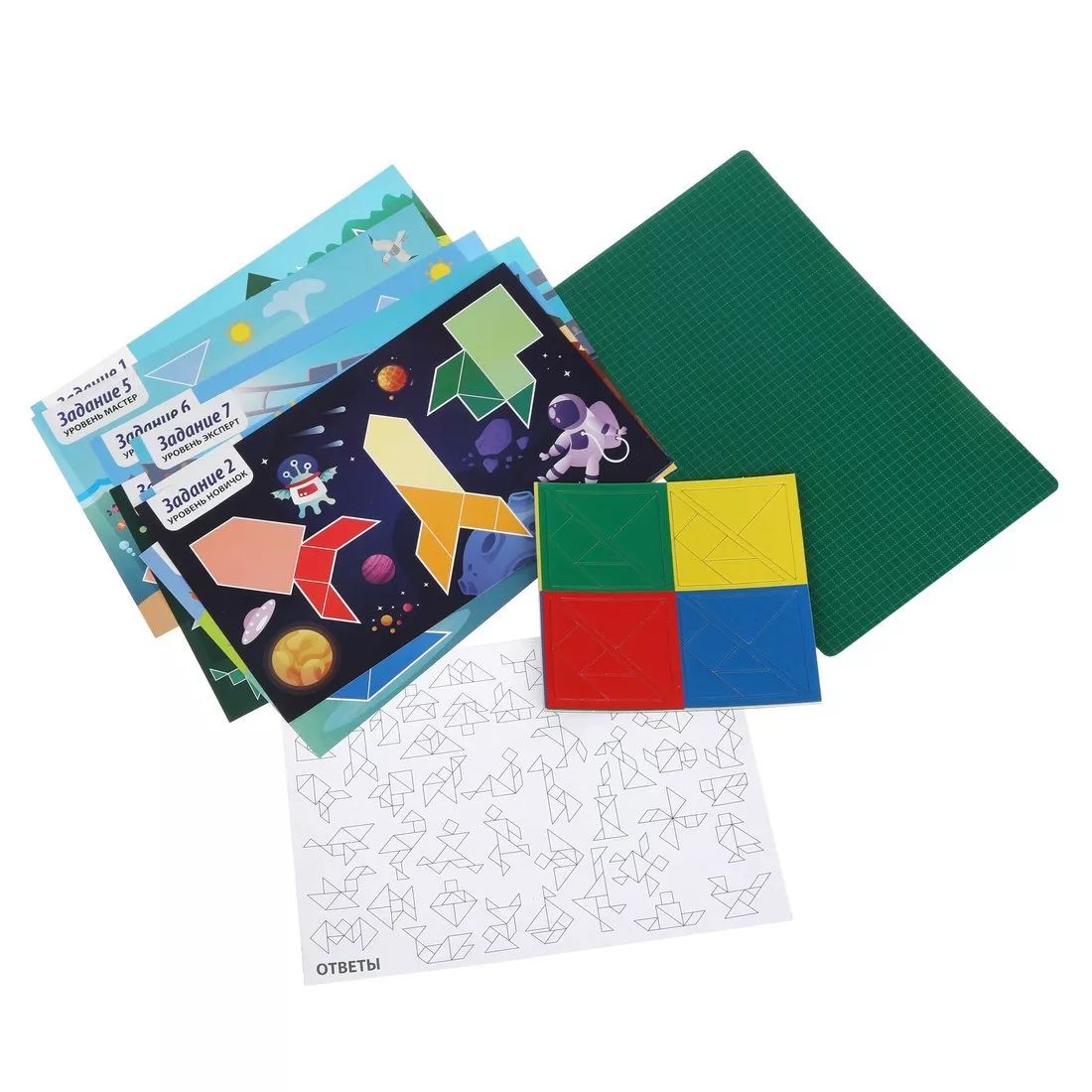 Handling time: 24 days Магнитный танграм с заданиями – игра на логику. Состав игры: двухстороннее магнитное игровое поле (23,5 х 14,7 см), разноцветные магнитные блоки с деталями (5 х 5 см) – 4 шт., всего 28 деталей (цвета: жёлтый, синий, красный и зелёный), карточки с заданиями – 8 шт., всего 47 заданий (22,5 х 3,7 см). Материалы: магнитомягкое железо, картон, магнит, бумага. Для детей страше 5 лет