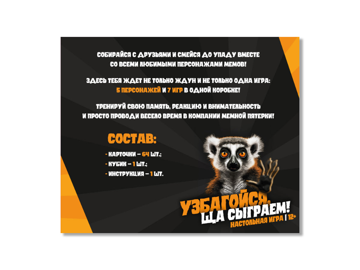 Handling time: 24 days Игра настольная "Узбагойся, ща сыграем!" Состав игры:карточки - 64шь, кубик - 1 шт, инструкция. Материалы: картон, полимерные материалы. Для детей, старше 12 лет.