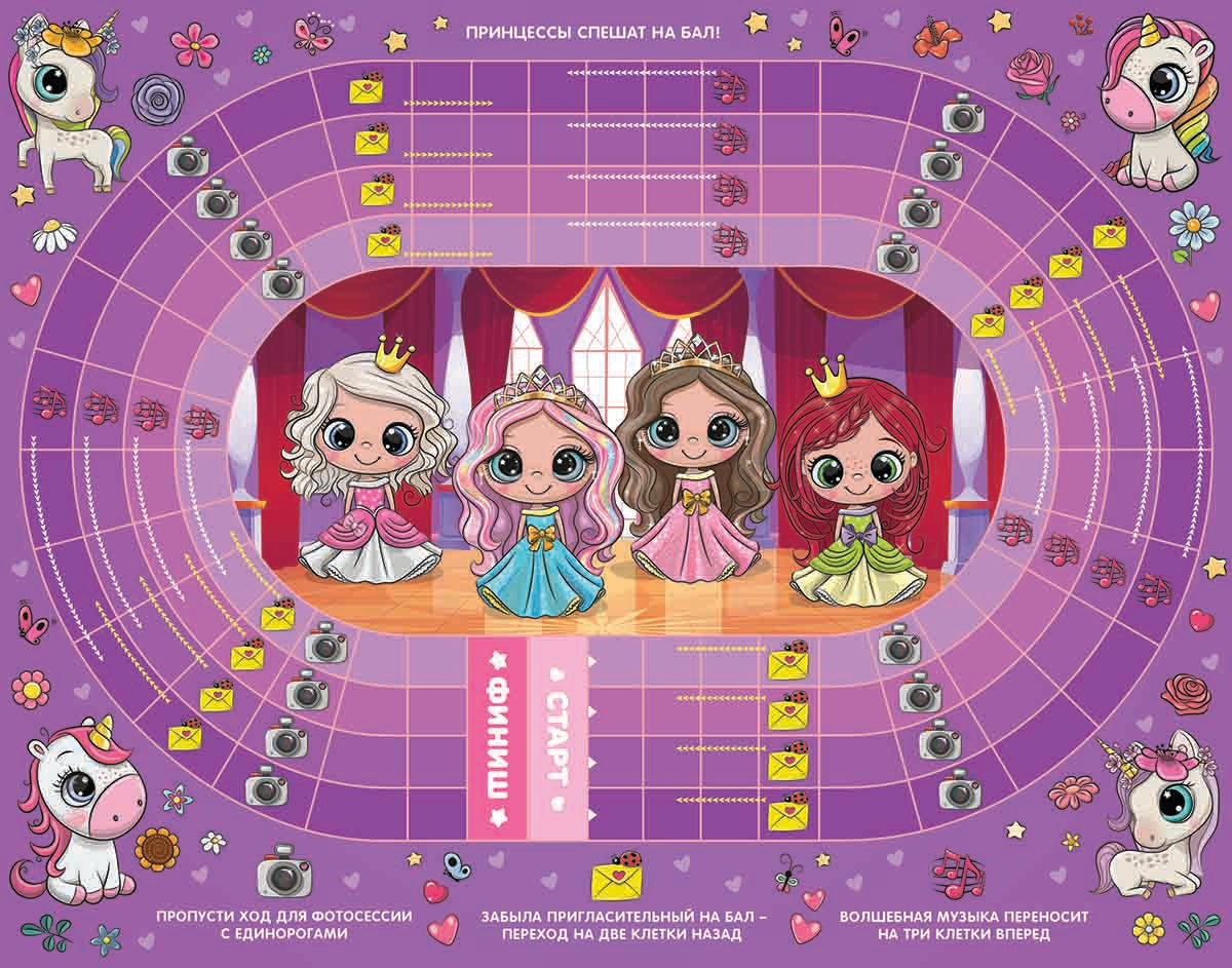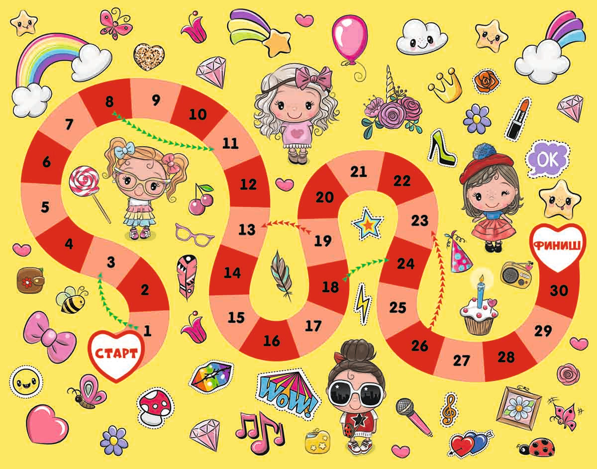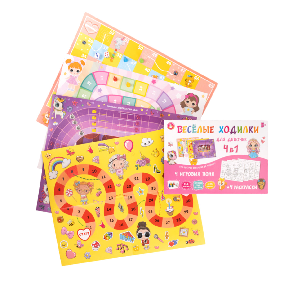 Игра настольная ходилка "Веселые ходилки 4 в 1" для девочек (ходилка-раскраска)