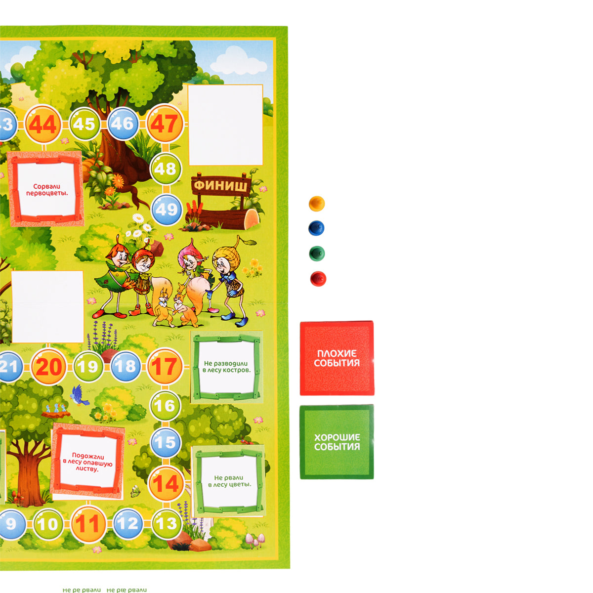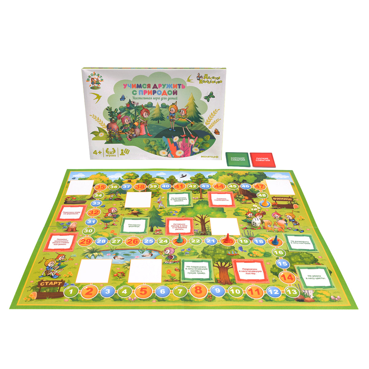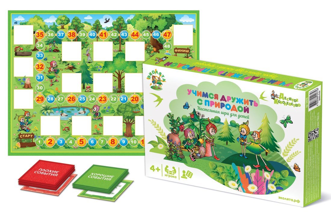 Handling time: 24 days Настольная игра ходилка Эколята «Учимся дружить с природой»Состав игры:игровое поле одностороннее из картона — 1 шт. (59 х 44,5 см), фишки четырёх цветов (синий, красный, зелёный, желтый) — 4 шт. (высота – 2 см), кубик — 1 шт. (1,5 х 1,5 см), картонные карточки с описанием — 16 шт., правила игры. Возраст: от 4 лет. Кол-во игроков: 2–4. Материал: пластик, картон.