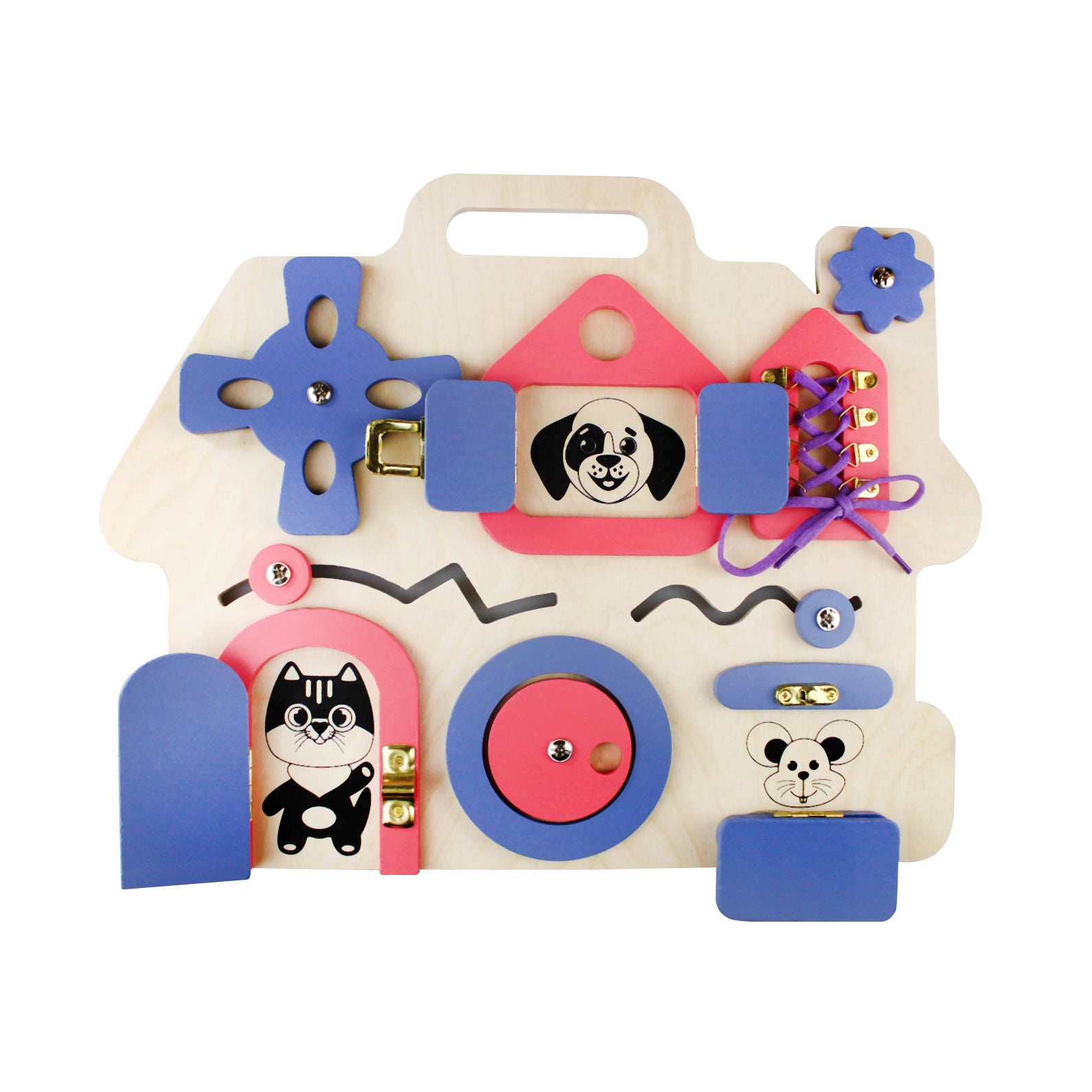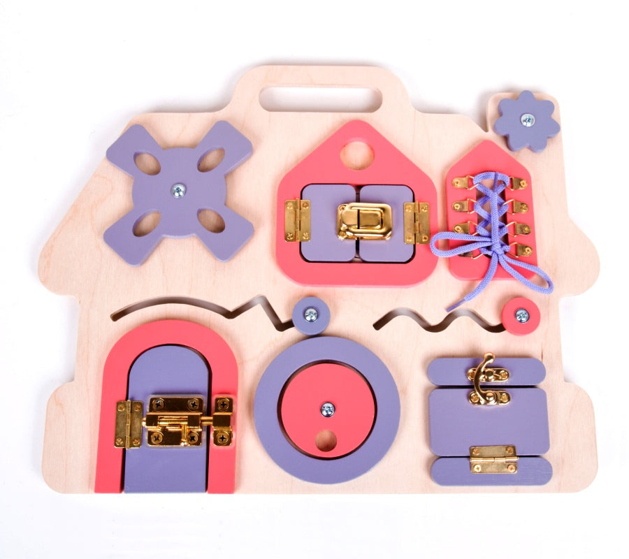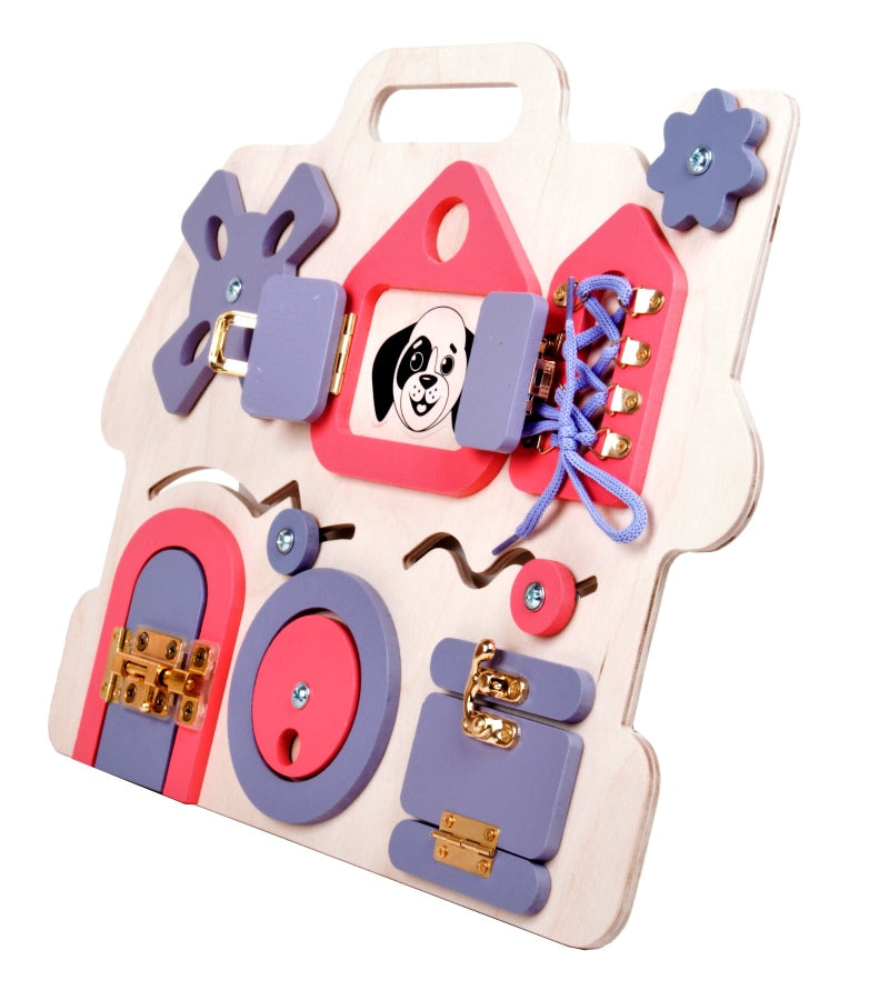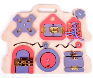 Бизиборд "Домик" поспособствует формированию у ребёнка мышления, логики, усидчивости и мелкой моторики рук. Бизиборд представляет собой развивающую доску для детей, на которой содержатся всевозможные замочки, щеколда, шнуровка, колёсики - все те элементы, которые, несомненно, заинтересуют ребёнка. Играть можно на столе или на полу, а также носить игрушку за "ручку". Размер бизиборда (ДхШхВ) составляет 37,5х29,5х1,5 см. Изделие изготовлено из дерева с элементами пластмассы, металла и текстильных материалов. Рекомендованный возраст: 3-5 лет.