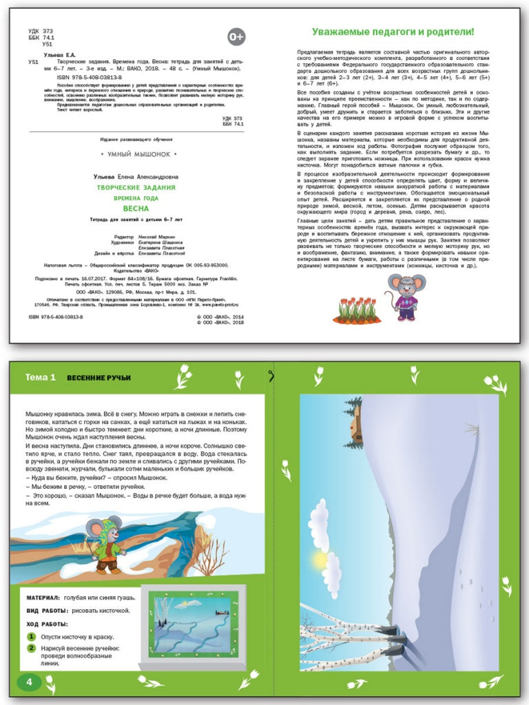 Пособие составлено в соответствии с Федеральным государственным образовательным стандартом дошкольного образования, программными требованиями в сфере дошкольного образования. Способствует формированию у детей представления о характерных особенностях времён года, интереса и бережного отношения к природе, а также умения ориентироваться на плоскости, аккуратно и безопасно работать с различными материалами и инструментами. Позволяет развивать мелкую моторику рук, память, внимание, воображение. Предназначается педагогам дошкольных образовательных учреждений и родителям. Текст читает взрослый. Цена: 164.00 руб. шт. Автор(ы): Ульева Е.А.Количество страниц: 48ISBN: 978-5-408-03813-8Формат: 84х108/16 (200х260 мм)Переплет: обложкаПриложение для AndroidПриложение для iOSМожно терять время в поисках, где скачать бесплатно, а можно купить эту книгу прямо сейчас!load_event: page_load widget_id: Kg92rtOr3Q41csx3L19j book_author: Ульева Е.А.book_name: Творческие задания. Времена года. Весна: тетрадь для занятий с детьми 6–7 летbook_isbn: 978-5-408-03813-8 Другие книги серии:Творческие задания: раскрашивание, лепка, аппликация: тетрадь для занятий с детьми 6–7 лет Времена года. Творческие задания для детей 6–7 лет Развивающие задания. Логика: тетрадь для занятий с детьми 6–7 лет Учим цифры: развивающее пособие для детей Сценарии сказок для интерактивных занятий с детьми 2–6 лет Мышонок в Царстве логики: тетрадь для занятий с детьми 5–7 лет Мастерская творчества. Рисуем и раскрашиваем с Мышонком: тетрадь для занятий с детьми 6–7 лет Развивающие задания. Мышонок-следопыт: тетрадь для занятий с детьми 6–7 лет Творческие задания. Времена года. Лето: тетрадь для занятий с детьми 6–7 лет Учим буквы: развивающее пособие для детей Готовим руку к письму: тетрадь для занятий с детьми 6–7 лет Творческие задания. Времена года. Осень: тетрадь для занятий с детьми 6–7 лет Развивающие задания. Развитие речи: тетрадь для занятий с детьми 6–7 лет Раскрашиваем по образцу. Мышонок и машина времени: развивающее пособие для детей 6–7 лет Творческие задания. Времена года. Зима: тетрадь для занятий с детьми 6–7 лет