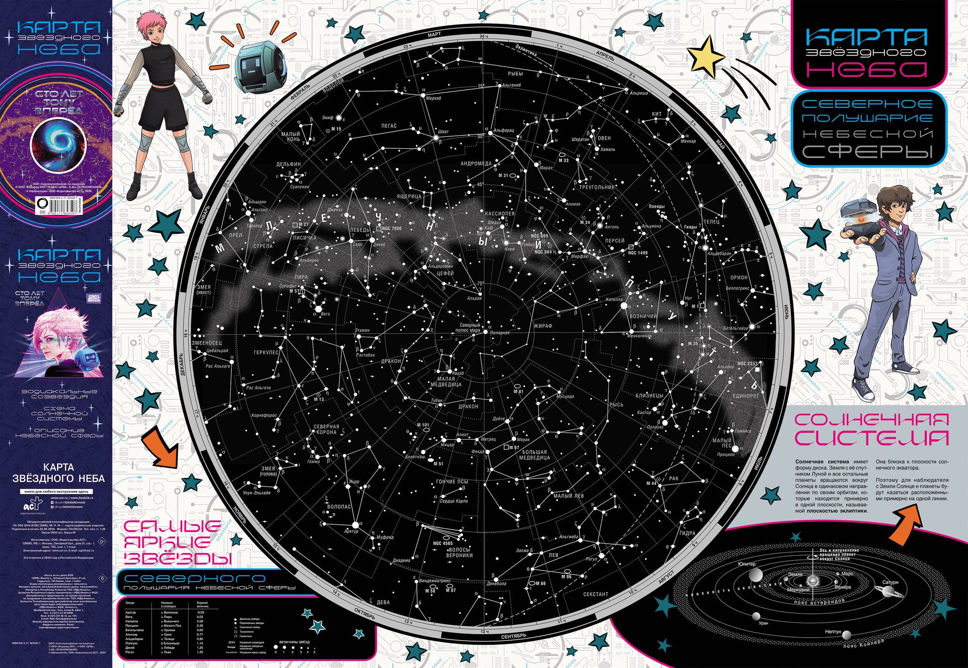 Складная двухсторонняя карта имеет размеры 680х990 мм. Звёздное небо показано в виде карт северного и южного полушарий небесной сферы. Именно так ночное небо с мерцающими на нём галактиками, туманностями и звёздными скоплениями можно увидеть с Северного и Южного полюсов Земли.Звёзды на карте ранжированы по видимой звёздной величине. Даны названия самых ярких звёзд и условные очертания всех 88 созвездий. Приведёны краткие сведения о Солнечной системе, небесной сфере, звёздных координатах, эклиптике и зодиакальном круге. Размеры карты в сложенном виде 110х227 мм. Карта будет полезна для всех, кто интересуется астрономией. А яркие и красочные изображения героев фильма "Сто лет тому вперед" превращают полезную и насыщенную информацией карту в красочный постер, который можно разместить на стене. Из какой галактики Алиса, как космеон попал в руки к Коле - изучая карту звездного неба, вспоминай фильм и его героев, фантазируй. Твое виртуальное путешествие по созвездиям сможет вместить восхищение, удивление и массу других положительных эмоций, связанных с изучением карты звездного неба.
