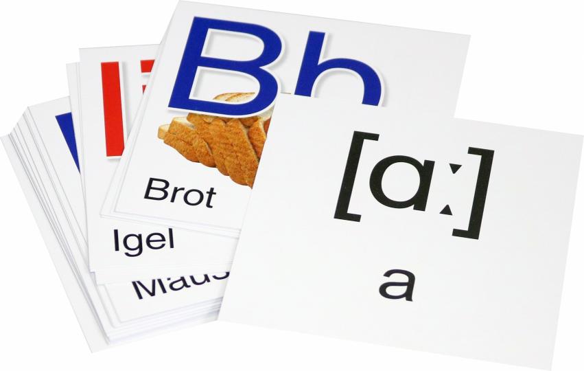 На каждой карточке с одной стороны даны строчная и прописная буквы немецкого языка, картинка и слово, начинающееся на представленную на карточке букву. С другой стороны карточки дается звуковое обозначение буквы и ее транскрипция. Три карточки содержат загадки на разные буквы немецкого алфавита.