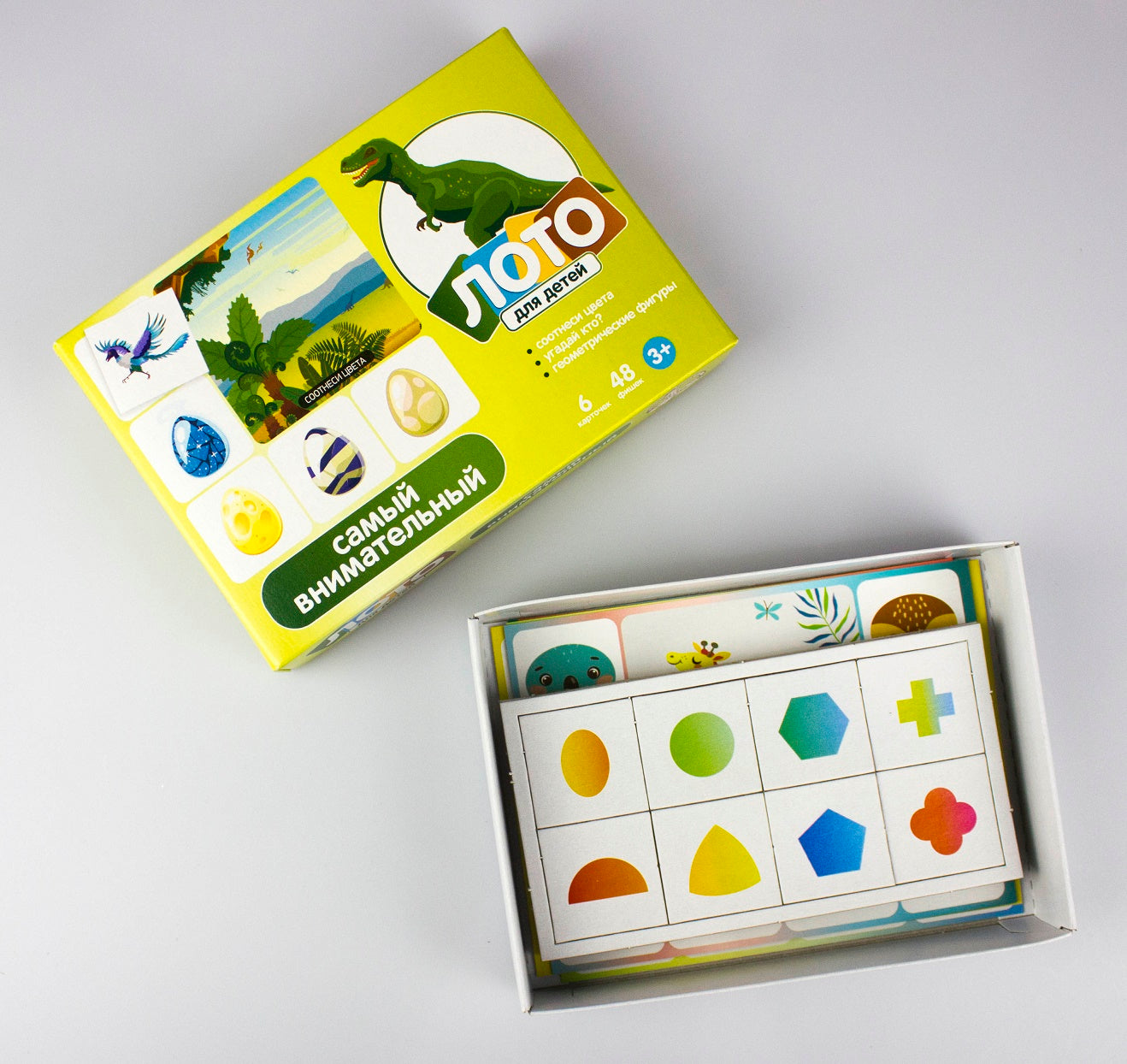 Handling time: 24 days Лото «Самый внимательный». Состав: карточки – 6 шт. (148 х 109 мм), фишки – 48 шт. (3,5 х 3,5 см). Материал: картон. Для детей от 3 лет, для 2–6 игроков. Развивает внимание, память, наблюдательность, речь и кругозор.