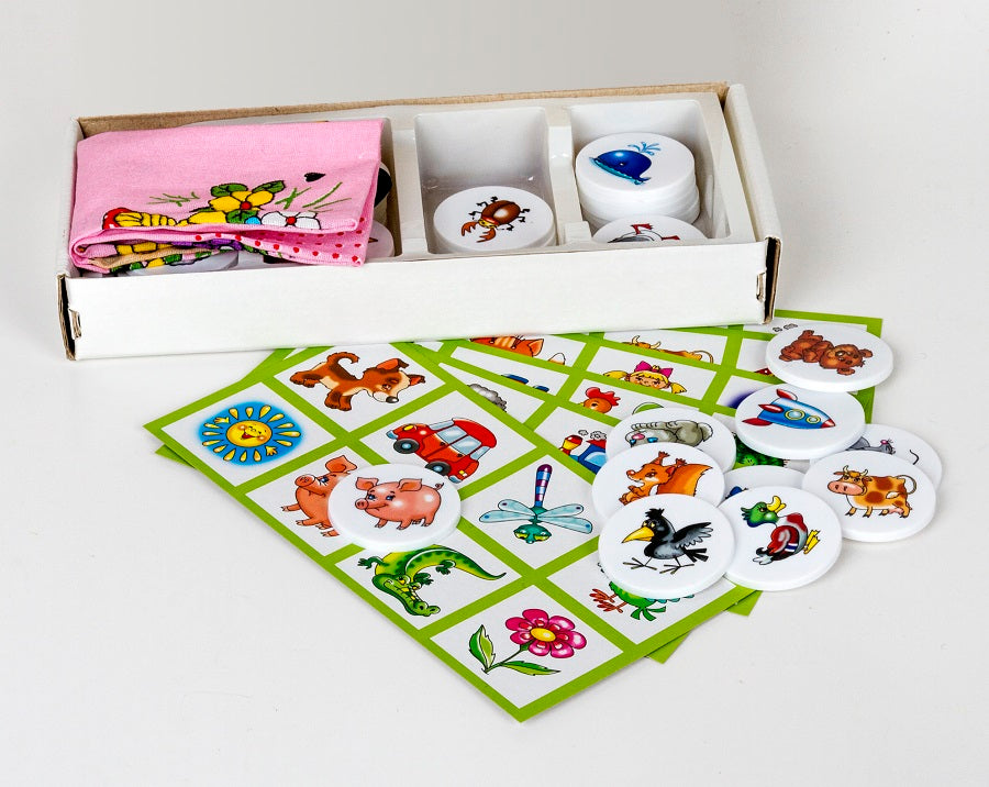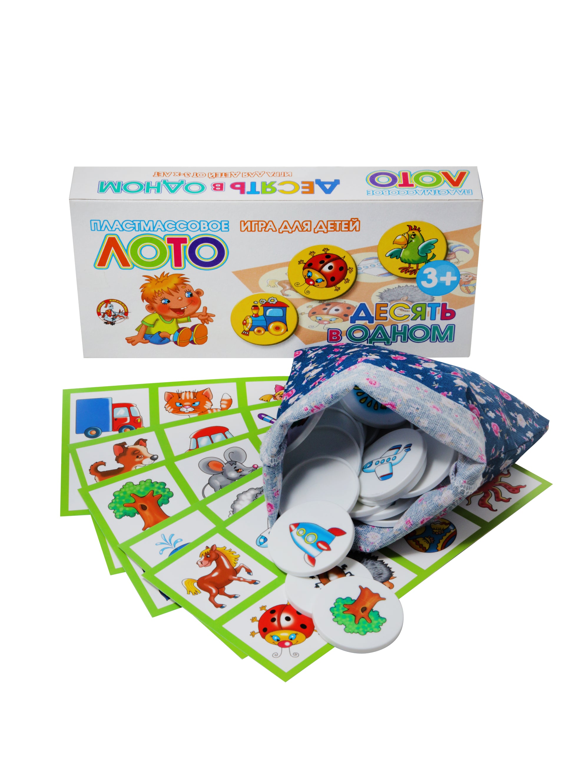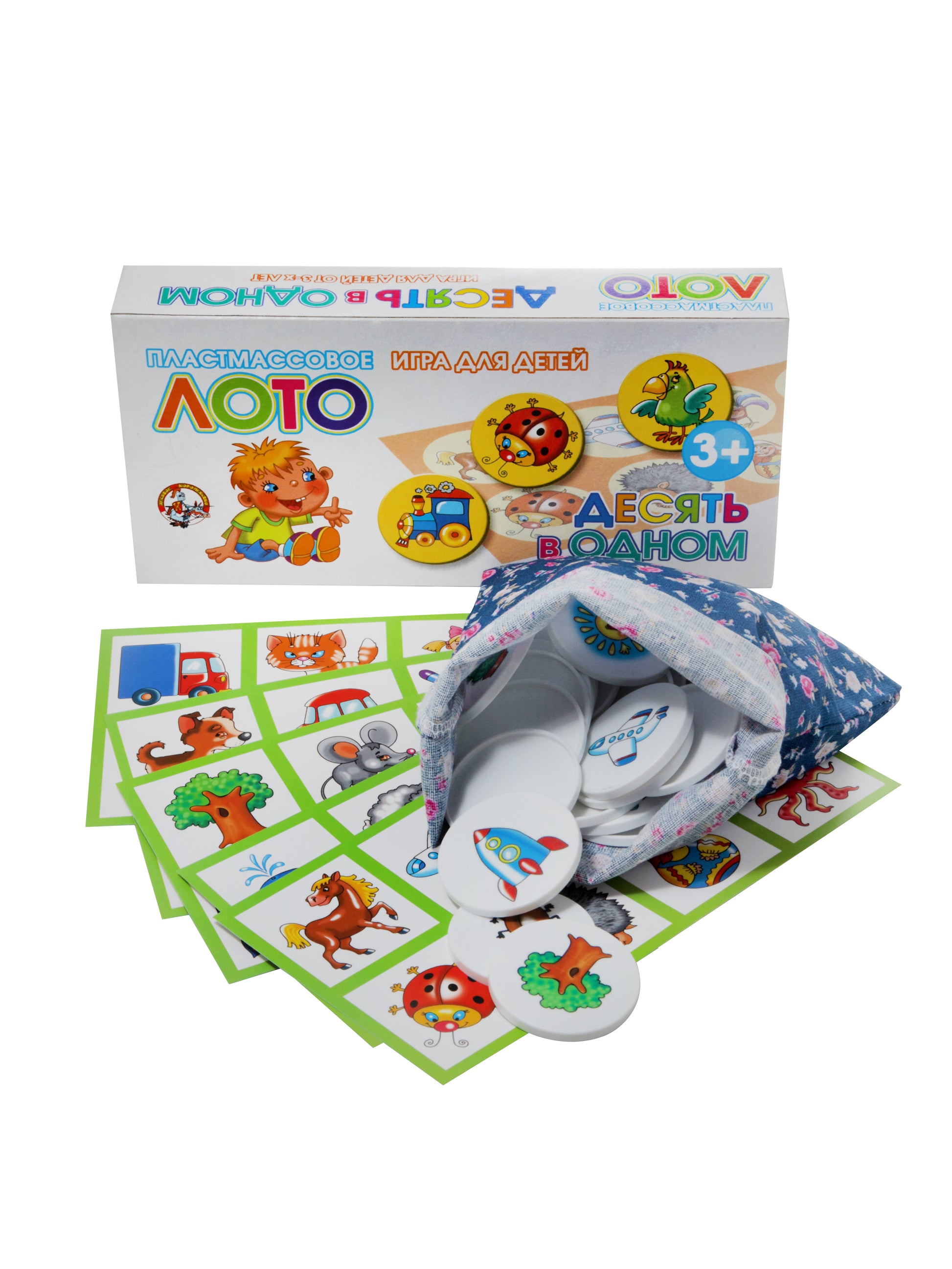 Handling time: 14 days Лото с пластиковыми фишками 10 в 1. Состав: картонные карточки – 6 шт., фишки пластиковые – 48 шт. (диаметр – 4 см), мешочек из ткани для фишек – 1 шт. Материал: картон, пластик, ткань. Для детей от 3 лет, для 1–6 игроков. Лото развивает память, внимание, мелкую моторику рук, помогает освоить навыки обобщения и расширить кругозор. Игра в картонной упаковке.