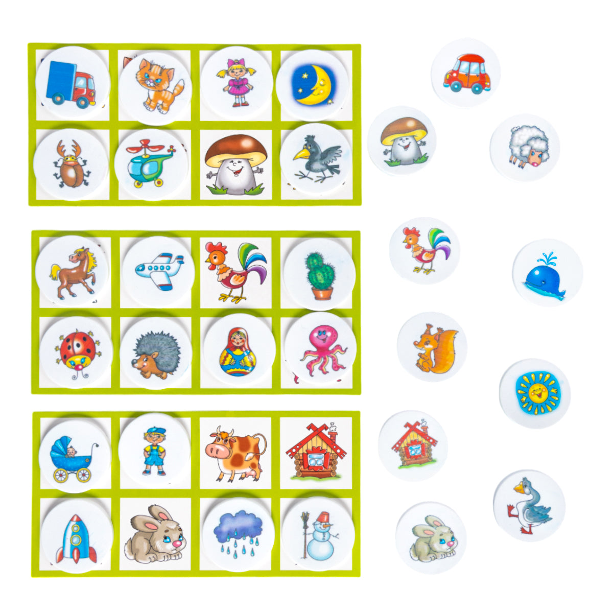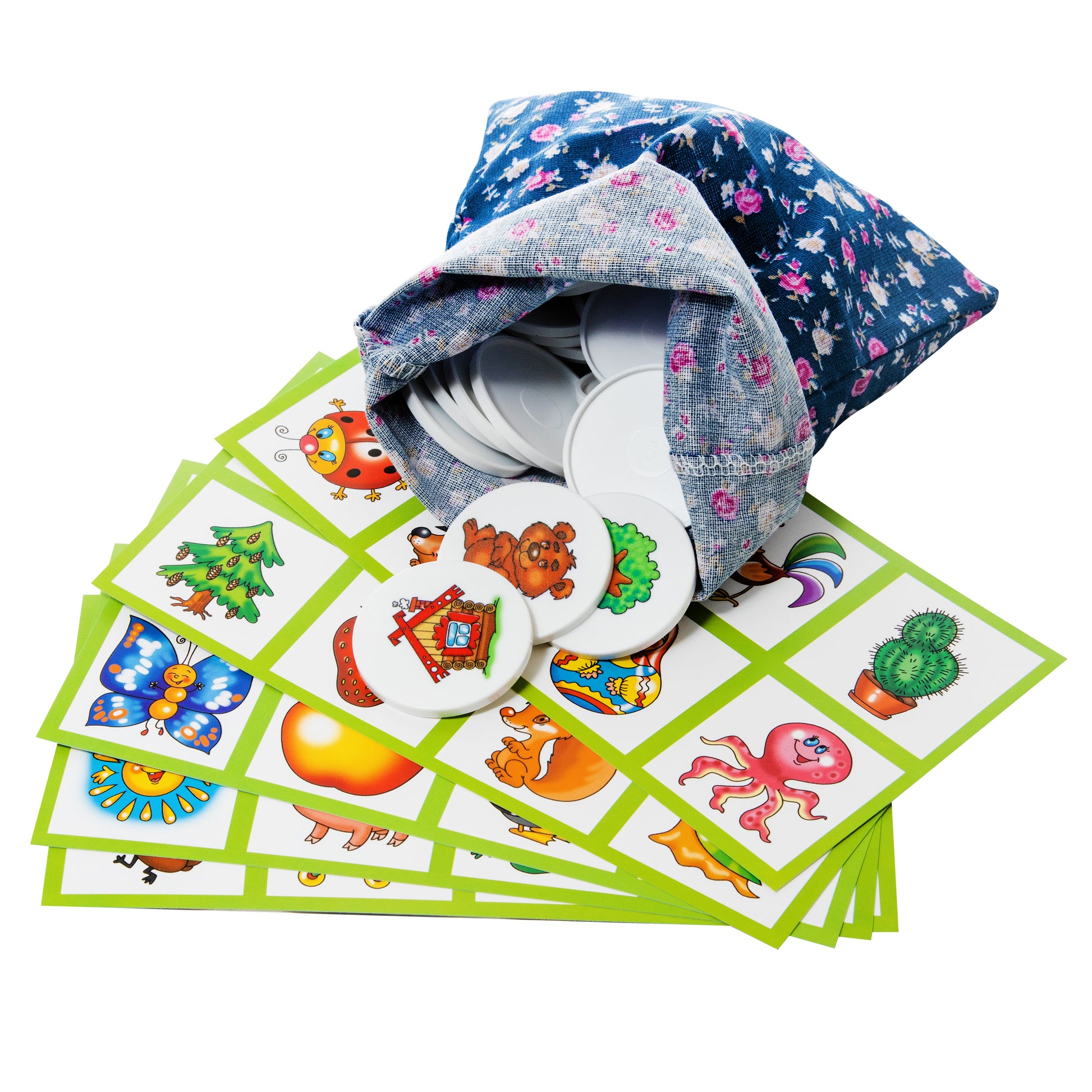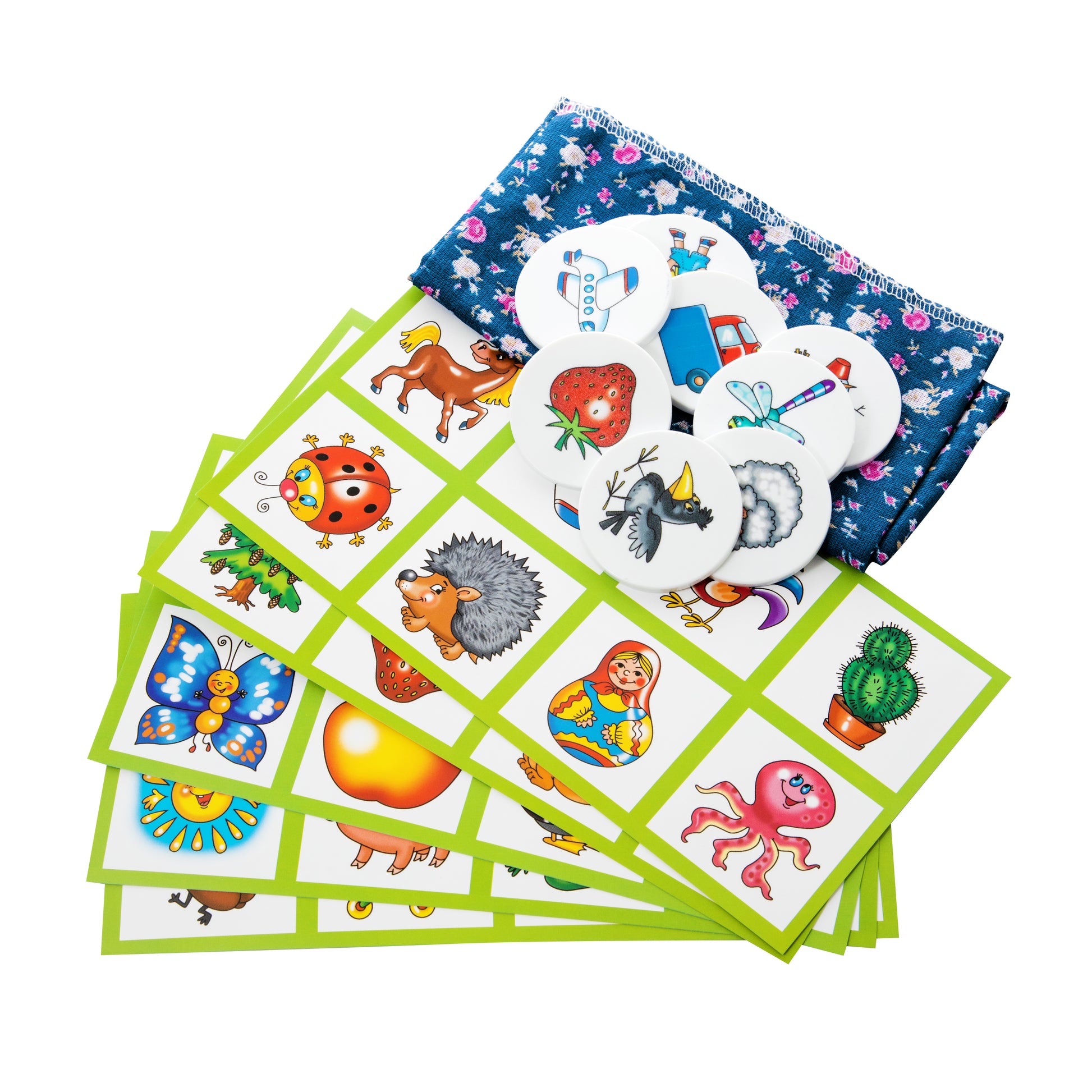 Handling time: 14 days Лото с пластиковыми фишками 10 в 1. Состав: картонные карточки – 6 шт., фишки пластиковые – 48 шт. (диаметр – 4 см), мешочек из ткани для фишек – 1 шт. Материал: картон, пластик, ткань. Для детей от 3 лет, для 1–6 игроков. Лото развивает память, внимание, мелкую моторику рук, помогает освоить навыки обобщения и расширить кругозор. Игра в картонной упаковке.