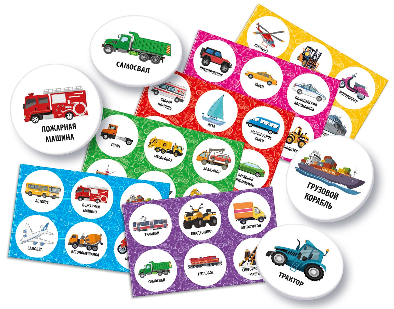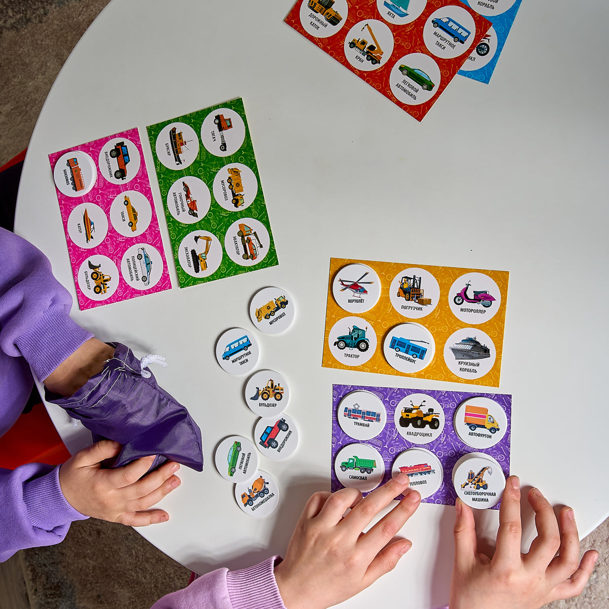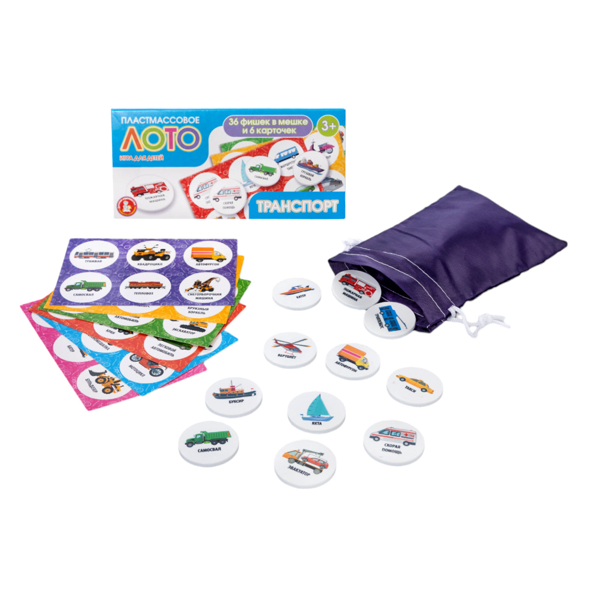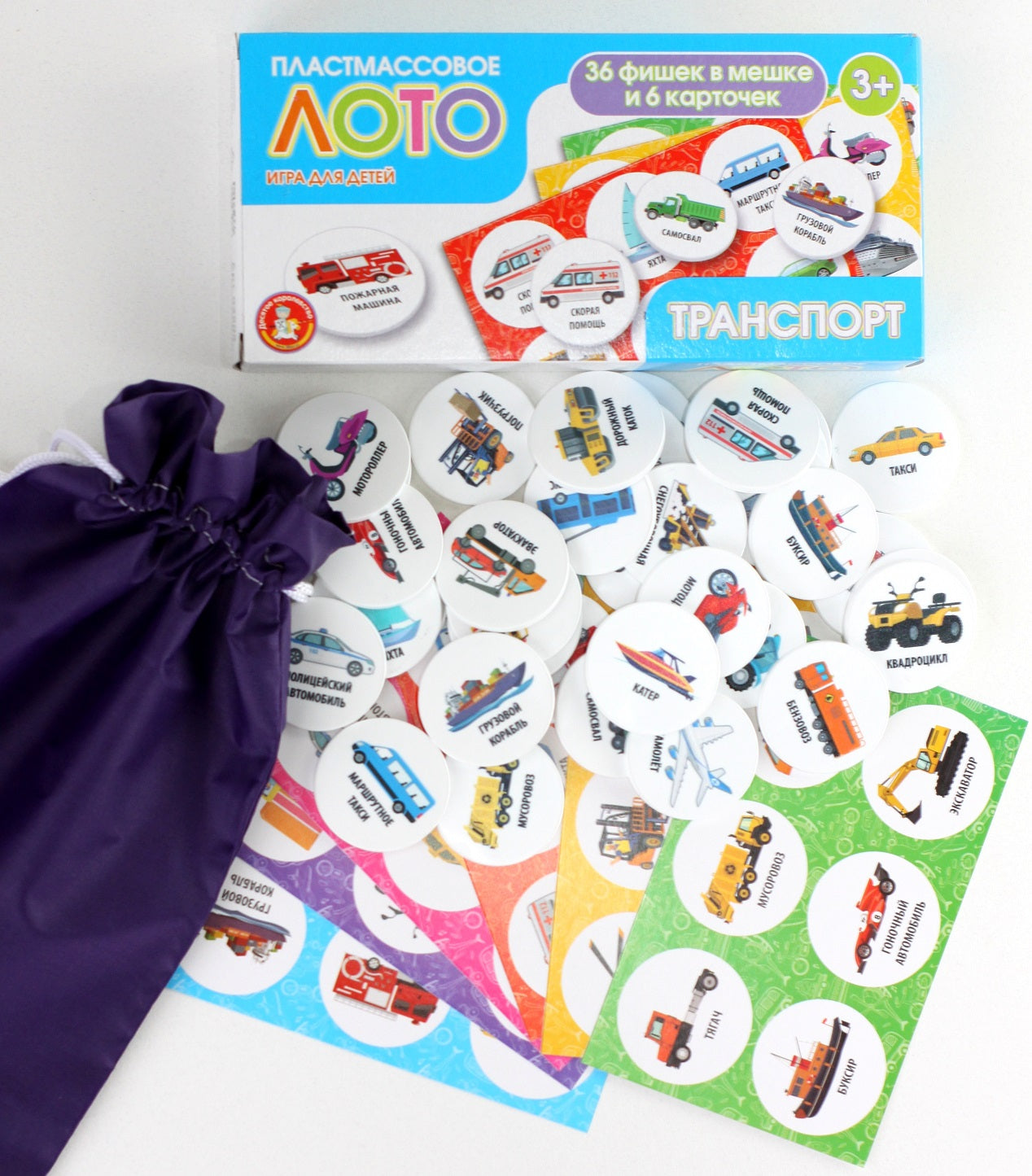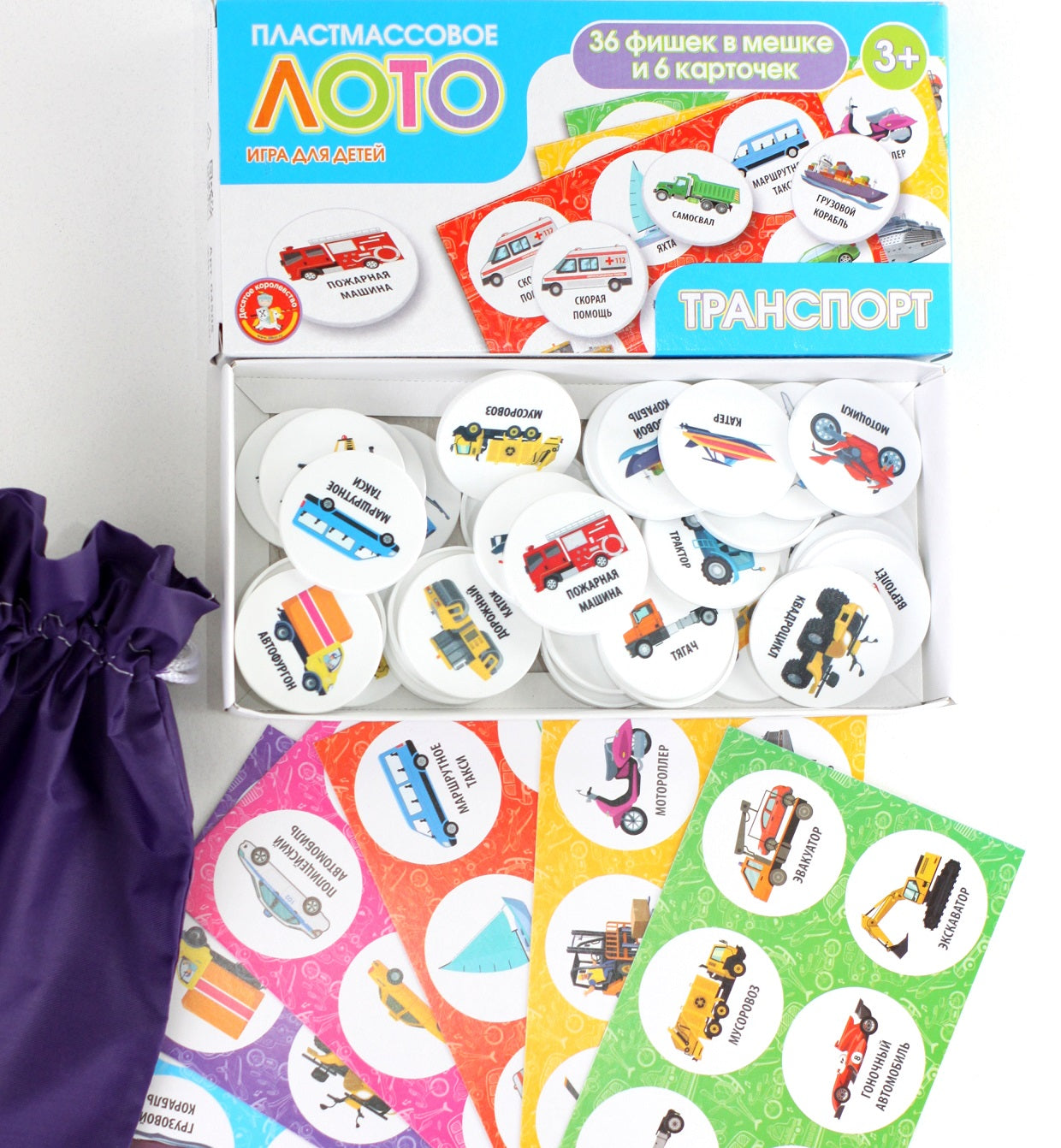 Handling time: 14 days Лото пластиковое «Транспорт». Состав: картонные карточки – 6 шт. (14,5 х 9 см), фишки пластмассовые – 36 шт. (диаметр – 4 см, толщина – 0,3 см), мешочек из ткани для фишек – 1 шт. (30 х 18 см). Материал: картон, пластик, ткань. Для детей от 3 лет, для 1–6 игроков. Лото знакомит с основными видами транспорта, а также развивает память, внимательность и навыки обобщения.