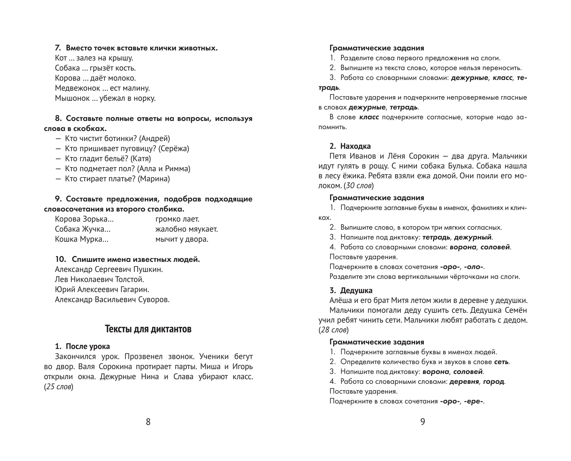 Учебное пособие соответствует образовательным стандартам обучения русскому языку в начальной школе. Сборник включает в себя задания и тексты для усвоения основных грамматических понятий учащимися первого класса. В нём представлены материалы для грамматических заданий по всем темам; тексты диктантов с грамматическими заданиями, которые можно использовать как для контрольного списывания, так и для самостоятельных работ; большой акцент сделан на работу со словарными словами. Тестовые работы будут способствовать закреплению правил и навыков правописания, основных тем русского языка, а орфографические диктанты помогут запомнить словарные слова и орфограммы. Пособие предназначено для учителей начальной школы, а также для родителей, заинтересованных в успешном освоении их детьми русского языка в период обучения в начальной школе.