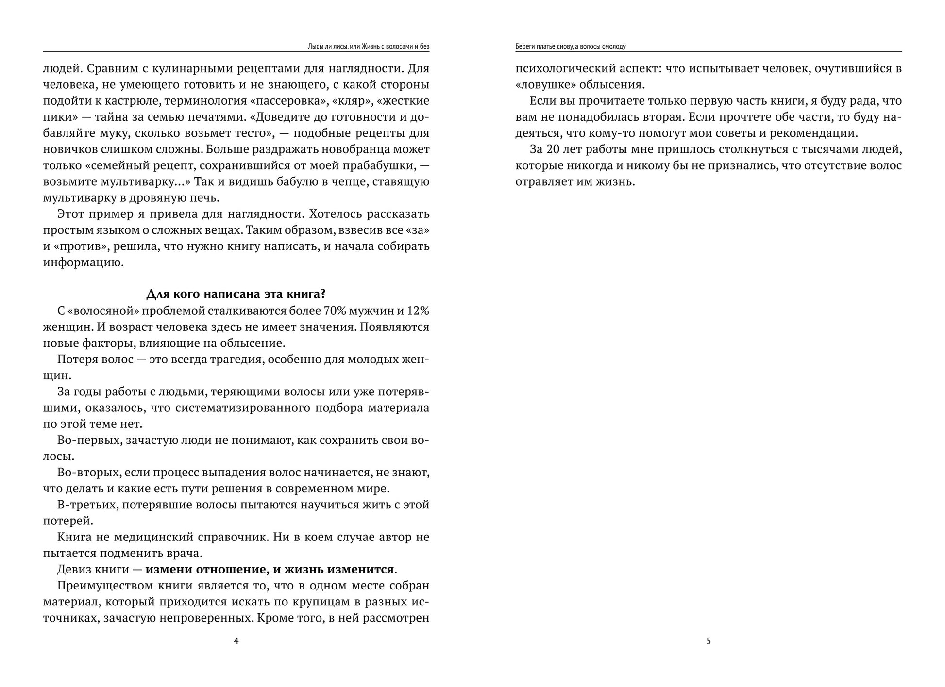 Цель издания - помочь людям с проблемами облысения найти их решение и поддержку, а для тех, кто открыл книгу случайно, будут полезны статьи о сохранении волос и профилактике их выпадения.