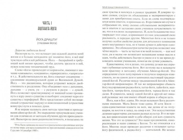 Данная книга отражает мировоззрение Йогачарьи Б.К.С. Айенгара и содержит сущность его представлений о йоге, к которым он пришел в своей многолетней садхане."Самую суть моего учения составляет стремление с максимальной практичностью и пользой показать, что любая, доведённая до совершенства, составляющая йоги содержит сущность остальных аспектов, макрокосма в микрокосме, или общего в частном, как генетический код содержится в ДНК каждой нашей клетки".