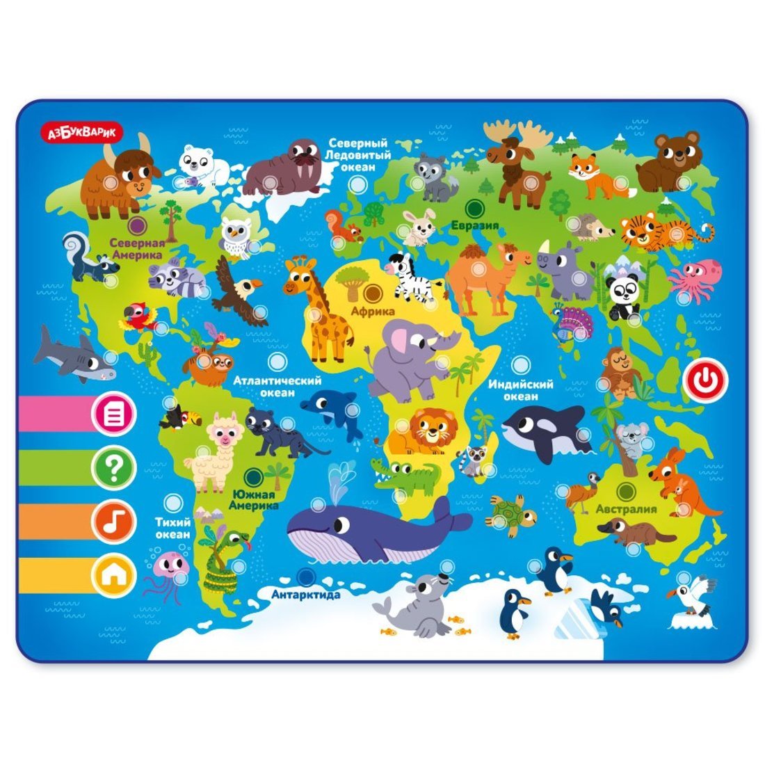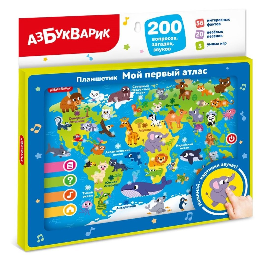 Планшетик «Мой первый атлас» - это настоящая говорящая карта мира для детей! Все картинки – говорящие! Нажимая на них, ребенок познакомится с животными, материками и океанами, послушает голоса и забавные звуки! Кроме того, ребенок сможет послушать 56 интересных фактов и 5 познавательных песенок («Вокруг света», «В джунглях», «В саванне», «В лесу», «Животные нашей планеты»)!Для проверки знаний в планшетике есть 5 игр: «Искалочка», «Чей голос?», «Весёлые загадки», «Зоовикторина», «Угадайка». Обучение через игру – это эффективный, инновационный и современный подход! Всего в игрушке 200 вопросов, загадок, звуков.Планшетик «Мой первый атлас» способствует интеллектуальному развитию ребенка и расширяет кругозор. Эта игрушка отлично подходит для самостоятельного обучения.