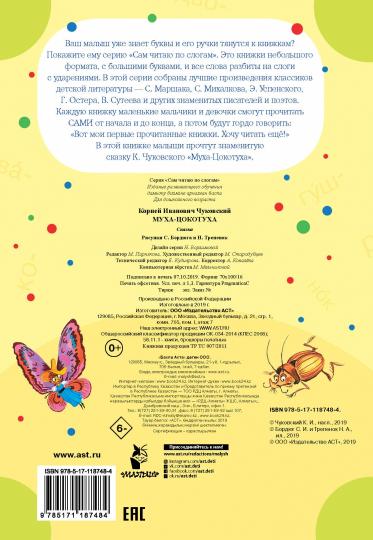 Ваш малыш уже знает буквы, и его ручки тянутся к книжкам? Дайте ему книжку из серии "Сам читаю по слогам".Эти книжки небольшого формата, с большими буквами, и все слова разбиты на слоги с ударениями.В этой серии собраны лучшие произведения классиков детской литературы - С. Маршака, С. Михалкова, Э. Успенского, Г. Остера, В. Сутеева и других знаменитых писателей и поэтов.Каждую книжку маленькие мальчики и девочки смогут прочитать сами от начала и до конца, а потом будут гордо говорить: "Вот мои первые прочитанные книжки. Хочу читать ещё!"В этой книжке малыши прочтут знаменитую сказку К. Чуковского "Муха-Цокотуха".Для дошкольного возраста.Крупный шрифт, разбивка на слоги, ударения, запоминающиеся цветные иллюстрации - в книгах серии "Сам читаю по слогам" есть всё необходимое для формирования у ребенка прочного навыка чтения и стимулирования устойчивого интереса к книге.А еще это прекрасная возможность познакомиться с лучшими произведениями любимых детских авторов, многие из которых стали неотъемлемой частью отечественной культуры. Знать их - признак образованного, культурного человека.Идеальное сочетание "цена-качество! Книги не будут обременительны для семейного бюджета и принесут массу пользы, создадут прекрасное настроение.Знаменитая сказка любимого детского автора Корнея Чуковского входит в школьную программу. Она обязательно понравится вашему малышу, и он с удовольствием будет читать книгу самостоятельно.
