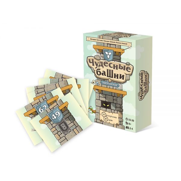«Чудесные башни» – карточная игра, для победы в которой нужно перевернуть свою башню с головы на ноги. Каждый игрок получает 7 карт из колоды и строит из них перевёрнутую башню, выкладывая карты в порядке возрастания их номеров. Ещё одна карта колоды вскрывается и становится общей. Для победы нужно раньше остальных привести свою башню в порядок: добиться, чтобы карты в ней лежали в порядке убывания номеров.Количество игроков: 2-4.Материал изготовления: картон.Рекомендованный возраст: 8 лет +