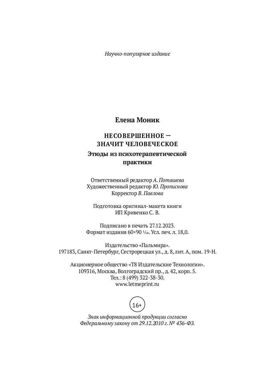 Handling time: 19 days Автор: Моник Елена, «Несовершенное — значит человеческое. Этюды из психотерапевтической практики»: Книга известного психолога и психоаналитика Елены Моник посвящена сложному процессу поиска и обретения каждым человеком внутреннего баланса между необходимостью выполнять требования социума, стандартами личных отношений и собой-подлинным. Используя примеры из своей богатой консультационной практики, автор пытается дать читателю возможность задуматься над собственными жизненными ориентирами, помочь обрести смелость в принятии нестандартных решений, прислушиваясь к подсказкам своей души.