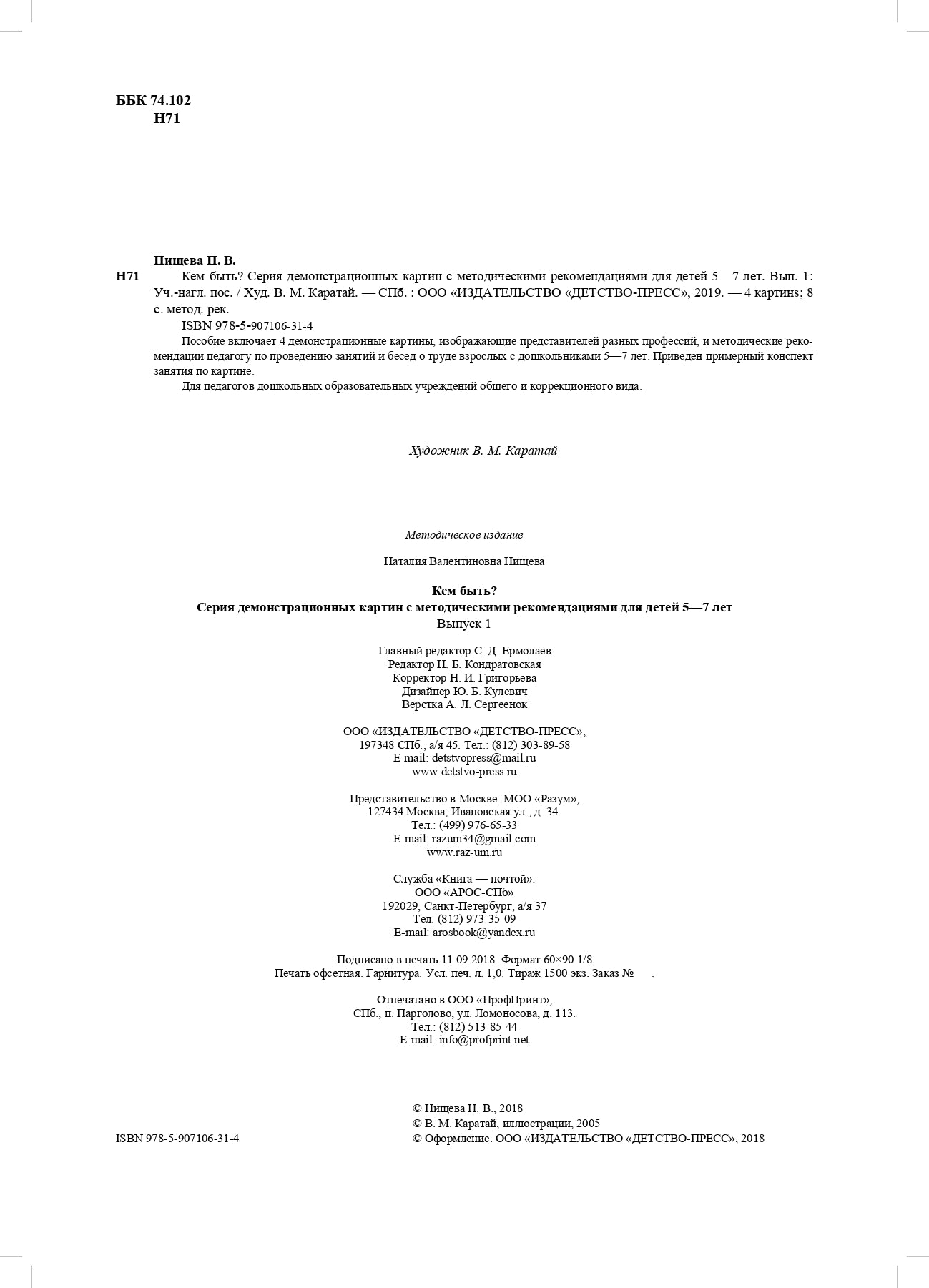 Handling time: 19 days Кем быть? Серия демонстрационных картин с методическими рекомендациями для детей 5—7 лет. Выпуск 1. Учебно - наглядное пособие. ФГОС. Нищева Н.В. Пособие включает 4 демонстрационные картины, изображающие представителей разных профессий, и методические рекомендации педагогу по проведению занятий и бесед о труде взрослых с дошкольниками 5—7 лет. Приведен примерный конспект занятия по картине. Для педагогов дошкольных образовательных учреждений общего и коррекционного вида.