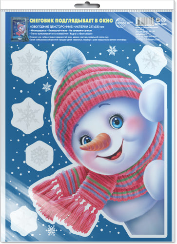 *НМТ1-16498 Новогодние наклейки на окна А4+ В ПАКЕТЕ. Снеговик подглядывает в окно. (видны с обеих сторон, снежинки из белил, в индивидуальной упаковке, с европодвесом и клеевым клапаном)