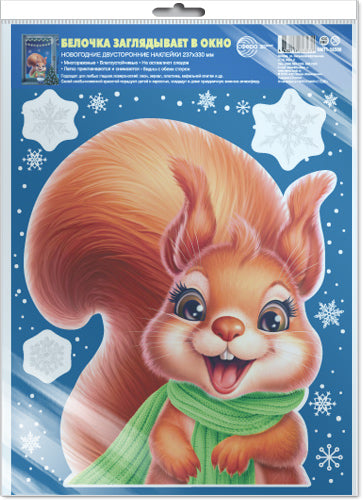 *НМТ1-16500 НОВОГОДНИЕ НАКЛЕЙКИ НА ОКНА А4+ В ПАКЕТЕ. Белочка заглядывает в окно (видны с обеих сторон, снежинки из белил, в индивидуальной упаковке, с европодвесом и клеевым клапаном)