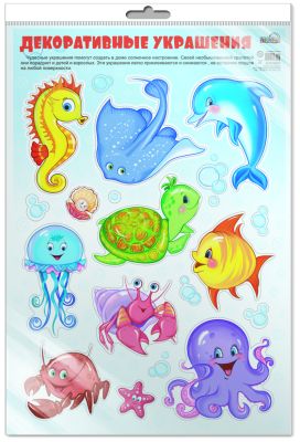 *Н-10627 НАКЛЕЙКИ А3 В ПАКЕТЕ. Декоративные украшения. Веселые морские обитатели (в индивидуальной упаковке, с европодвесом и клеевым клапаном)