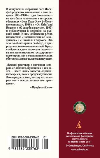 В книгу вошли избранные эссе Иосифа Бродского, написанные в эмиграции в 1980–1990-е годы. Большинство эссе были напечатаны в авторских сборниках «Less Than One» («Меньше единицы», 1986) и «On Grief and Reason» («О скорби и разуме», 1995) и публикуются в переводе на русский язык. К ним добавлены редко издаваемые «Размышления об исчадии ада» и «Писатель в тюрьме». Это тексты об истории и свободе, о природе власти и отношении к ней. Бродский рассуждает как о сути творчества вне зависимости от государственного строя, так и о влиянии внешних обстоятельств на человека пишущего.