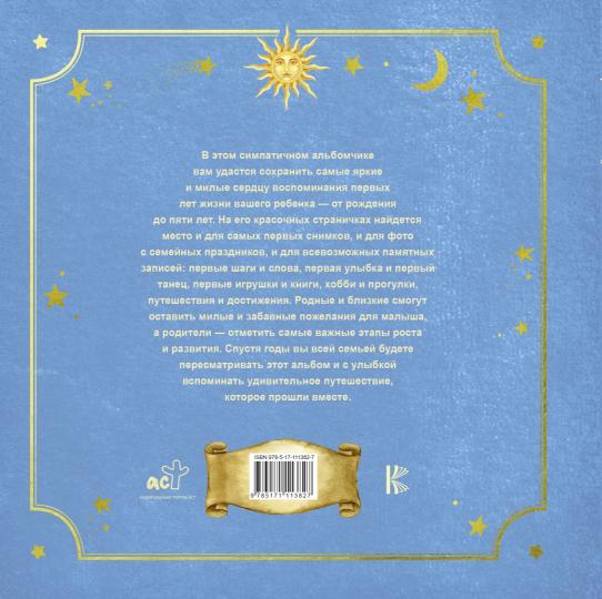 В этом симпатичном альбомчике вам удастся сохранить самые яркие и милые сердцу воспоминания первых лет жизни вашего ребенка — от рождения до пяти лет. На его красочных страничках найдется место и для самых первых снимков, и для фото с семейных праздников, и для всевозможных памятных записей: первые шаги и слова, первая улыбка и первый танец, первые игрушки и книги, хобби и прогулки, путешествия и достижения. Родные и близкие смогут оставить милые и забавные пожелания для малыша, а родители — отметить самые важные этапы роста и развития. Спустя годы вы всей семьей будете пересматривать этот альбом и с улыбкой вспоминать удивительное путешествие, которое прошли вместе.