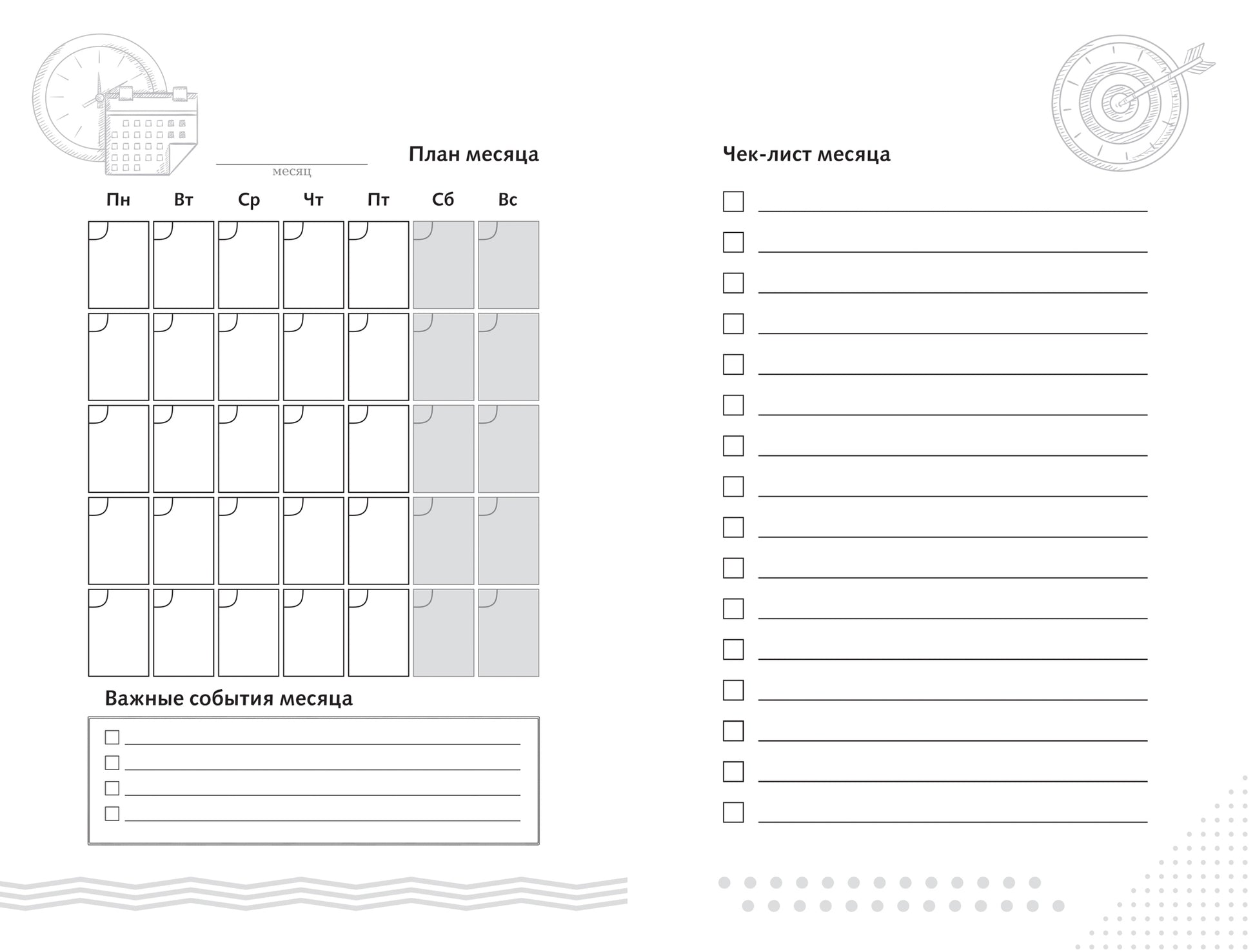 Еженедельник Оробинского комбинирует разные подходы к тайм-менеджменту. Перед каждым месяцем - лайфхаки и обобщения от автора, вопросы, ответив на которые вы утвердитесь в своих приоритетах.