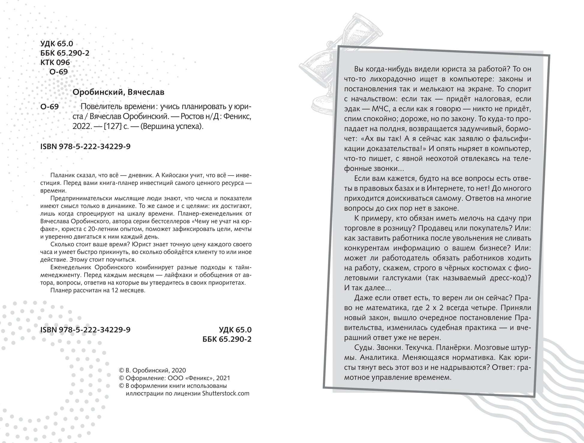 Предпринимательски мыслящие люди знают, что числа и показатели имеют смысл только в динамике. То же самое и с целями: их достигают, лишь когда спроецируют на шкалу времени. Планер-еженедельник от Вячеслава Оробинского, автора серии бестселлеров "Чему не учат на юрфаке", юриста с 20-летним опытом, поможет зафиксировать цели, мечты и уверенно двигаться к ним каждый день.