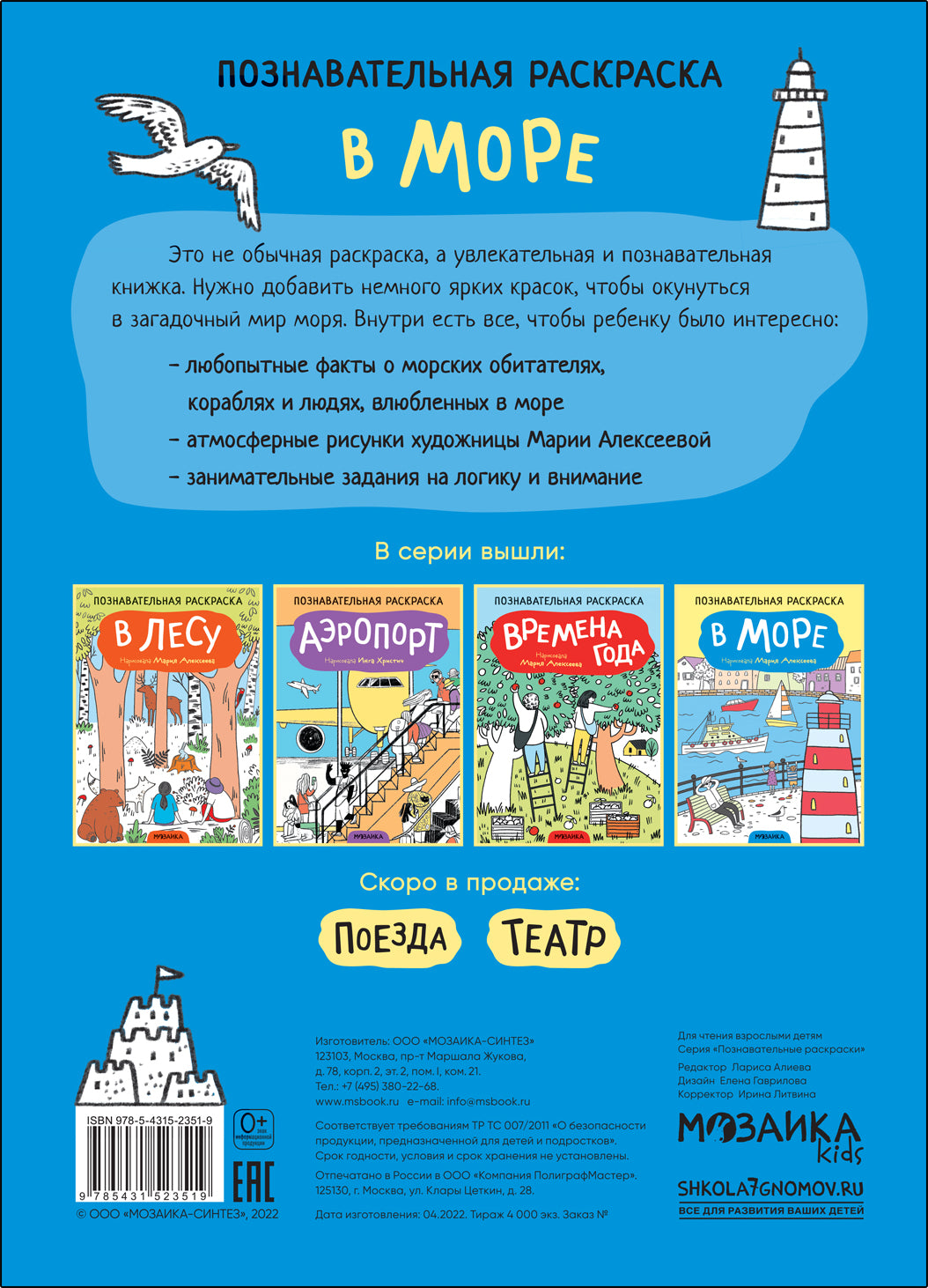 Handling time: 24 days В море (Познавательные раскраски) В раскраске «В море» из серии «Познавательные раскраски» есть все, чтобы ребенку было интересно: любопытные факты о морских обитателях, кораблях и людях, влюбленных в море; занимательные задания на развитие логики и внимания; атмосферные иллюстрации, погружающие в загадочный мир моря. Это не обычная раскраска, а настоящая книга — увлекательная и развивающая. Раскрашивая картинки страничка за страничкой, ребенок откроет для себя много нового и интересного. На каждой полосе иллюстрации сопровождают поясняющие тексты,...