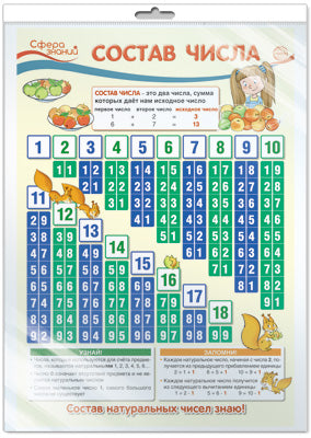 Плакат рекомендован для занятий по математике с учащимися 1-х классов общеобразовательных организаций. Соответствуют ФГОС начального общего образования по учебному предмету «Математика». Плакат дает представление о составе числа — числах, сумма которых дает исходное число. Плакат состоит из таблицы чисел, помогающей освоить простейшие арифметические операции, и информационных блоков «Узнай!» и «Запомни!», из которых школьники почерпнут много интересной и полезной информации о натуральных числах и действиях с ними. Каждый информационный блок имеет свою рамку и выделен отдельным цветом для лучшего запоминания. Материал содержит достаточное количество примеров, которые помогут школьникам лучше изучить состав числа. Плакат имеет удобный формат А3, его легко разместить в классной комнате, также с ним удобно изучать тему в домашних условиях.