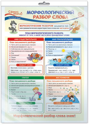 Плакат имеет удобный формат А3, каждый тематический блок выделен соответствующим цветом для лучшего запоминания и усвоения материала. Традиционно плакат начинается определением понятия «морфологический разбор слова» и заканчивается слоганом, формулирующим итоги работы по усвоению материала. Плакат дает представление о последовательности морфологического разбора частей речи, а также рекомендации по правильному разбору с различными примерами.