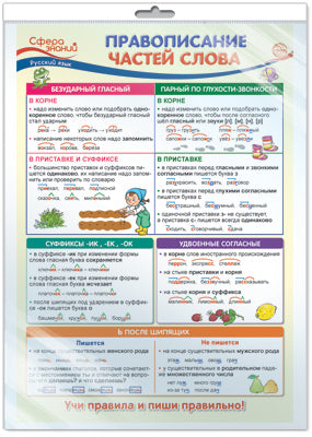 Плакат имеет удобный формат А3, каждое правило оснащено своим текстовым блоком и выделено отдельным цветом для лучшего запоминания. Плакат даст представление о правописании з–с на конце приставок перед гласными и согласными, в суффиксах -ик,-ек,-ок, на конце имен существительных после шипящих, поможет правильно написать слова с непроизносимым согласным и безударным гласным в корне слова. Каждый текстовой блок представлен примерами, которые можно использовать как алгоритм для работы с другими