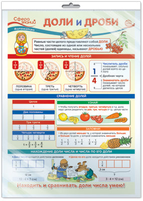 Плакат даст представление о чтении и записи долей, дробной черте, числителе и знаменателе дроби, научит сравнению долей и алгоритму нахождения половины, трети, четверти. Учащиеся узнают, как находить доли числа и число по его доли. Для удобства каждый текстовой блок проиллюстрирован примерами и выделен соответствующим цветом.