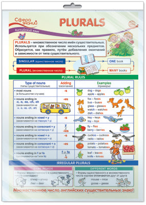 Plurals (Множественное число имен существительных)Плакат рекомендован для занятий по английскому языку с учащимися 3-х классовобщеобразовательных организаций. Соответствует ФГОС начального общего образования поучебному предмету «Английский язык».На плакате наглядно представлено понятийное различие между единственным имножественным числом имён существительных, а также приведены правила образованиямножественного числа от единственного. В зависимости от типа буквы, на которуюзаканчиваются имена существительные английского языка в единственном числе,выстраивается система правописания их окончаний во множественном числе.Плакат яркий, привлекающий к себе внимание ребёнка. Имеет удобный формат А3, его легкоразместить в классе или дома для изучения предложенного материала.
