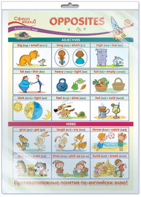 Opposites (Противоположности)Плакат рекомендован для занятий по английскому языку с учащимися 3-х классовобщеобразовательных организаций. Соответствует ФГОС начального общего образования поучебному предмету «Английский язык».Плакат поможет быстро и наглядно освоить на английском языке противоположные посмыслу понятия (антонимы), выраженные как именами прилагательными, так и глаголами.Все слова сопровождаются транскрипцией, что дает возможность не только узнать новыелексические единицы по данной теме, но и правильно их произносить. Яркие иллюстрациипозволят точно определить перевод слов.Плакат привлекает к себе внимание ребёнка. Имеет удобный формат А3, его легко разместитьв классе или дома для изучения предложенного материала.