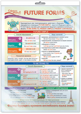 Плакат посвящен такой грамматической категории английского языка, как будущее время. В нем представлены времена и конструкции, формы которых передают различные виды значений какого-либо действия в будущем: Future Simple, to be going to, Present Simple, Present Continuous. Рассматриваются принцип образования форм будущего времени, случаи употребления, показатели времени, приводятся примеры употребления в речи. Для отдельных форм дается схема построения разных типов предложения: утвердительного, отрицательного,