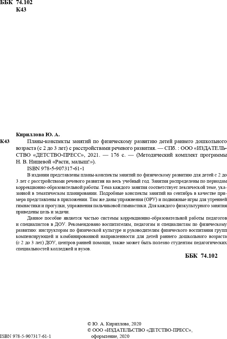 Handling time: 19 days В издании представлены планы-конспекты занятий по физическому развитию для детей с 2 до 3 лет с расстройствами речевого развития на весь учебный год. Занятия распределены по периодам коррекционно-образовательной работы. Тема каждого занятия соответствует лексической теме, указанной в тематическом планировании. Подробные конспекты занятий на сентябрь в качестве примера представлены в приложении. Там же даны упражнения (ОРУ) и подвижные игры для утренней гимнастики и прогулки, упражнения пальчиковой гимнастики. Для каждого физкультурного занятия приведены цель и задачи. Данное пособие является частью системы коррекционно-образовательной работы педагогов