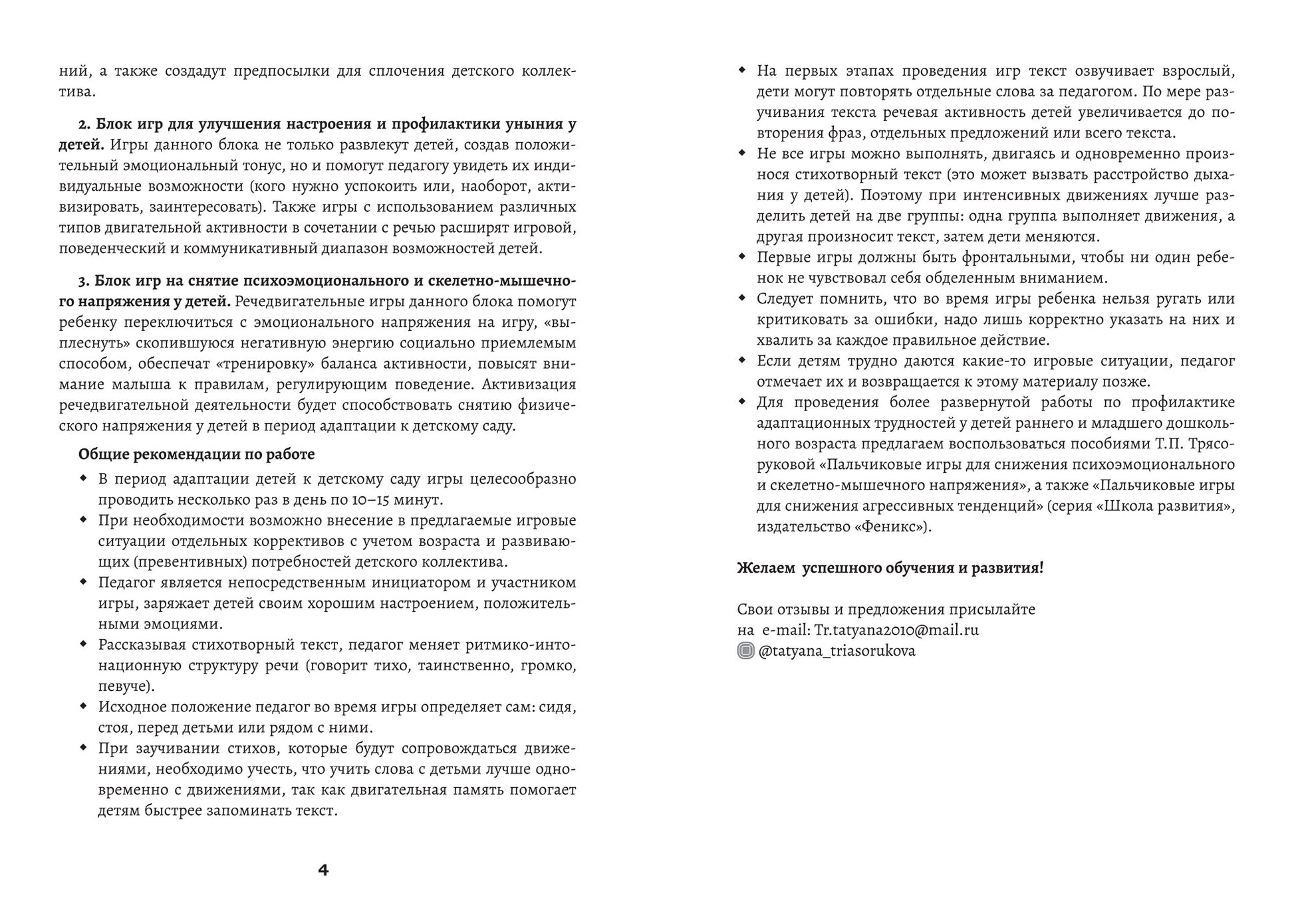Handling time: 14 days Адаптация ребенка к новым социальным условиям (детскому саду) может протекать очень болезненно, поэтому в этот период важно создать для малыша специальные превентивные и развивающие условия, обеспечив ему поддержку. Речедвигательные игры оказывают благотворное влияние на психофизическое состояние малыша и являются ресурсом, благодаря которому ребенок раннего и младшего дошкольного возраста сможет преодолеть адаптационные трудности и начать период гармоничного развития. Пособие будет интересно специалистам детского сада: воспитателям, педагогам-психологам, музыкальным руководителям, а также родителям для снятия психоэмоционального и скелетно-мышечного напряжения у детей в период адаптации к условиям детского сада.