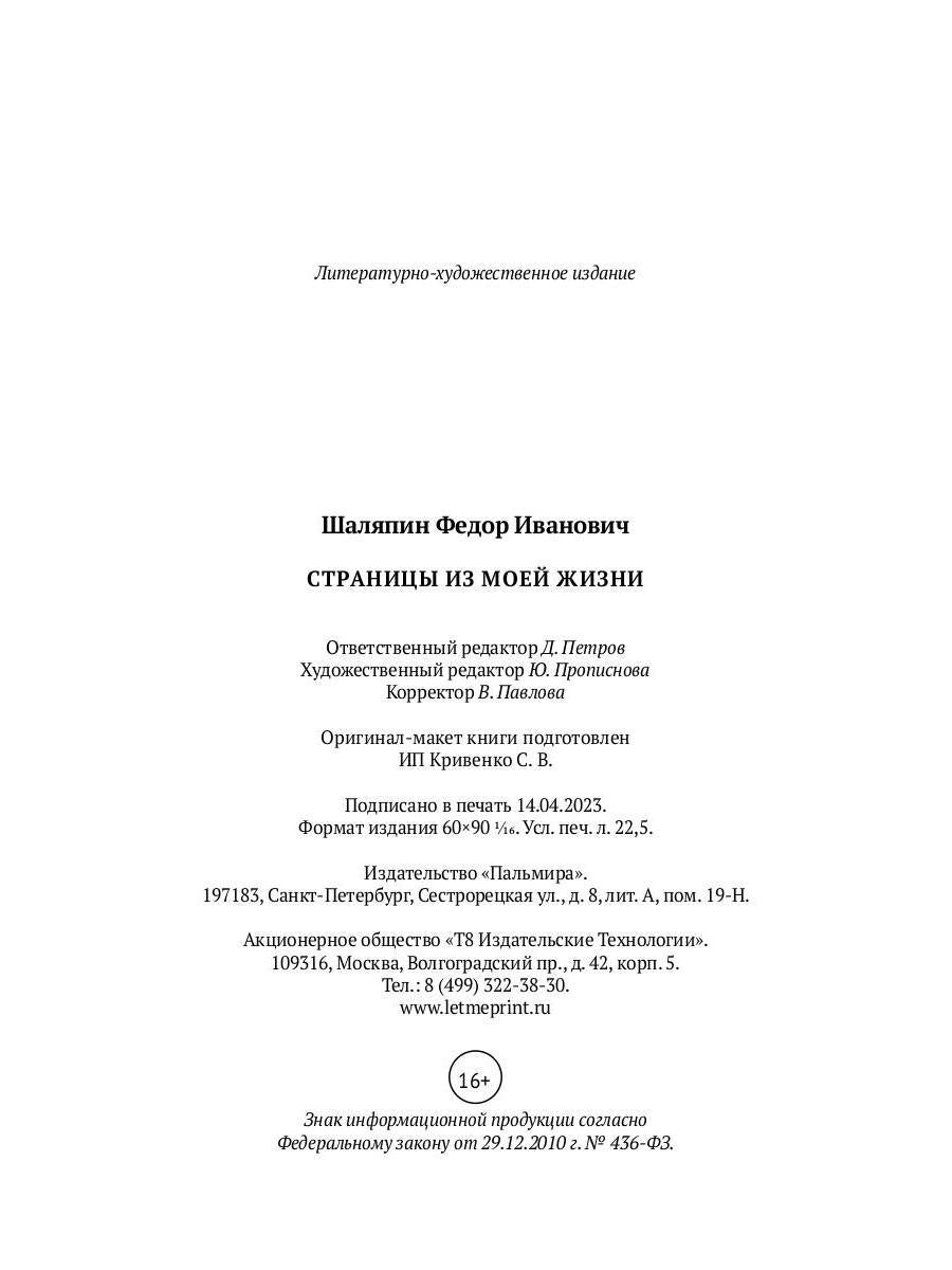 Handling time: 19 days Автор: Шаляпин Ф.И., «Страницы из моей жизни»: Федор Иванович Шаляпин (1873–1938) - оперный и камерный певец, солист Мариинского и Большого театров. Один из самых известных оперный исполнителей в истории России. Шаляпин оказал большое влияние на мировое оперное искусство. В автобиографической книге "Страницы из моей жизни" Шаляпин просто и правдиво рассказывает о своем трудном детстве, прошедшем в бедности и среди пьянства, знакомстве с музыкой, поразившей его до глубины души, первых шагах на сцене, приходящем успехе, впечатлениях от заграничных поездок, встречах с выдающимися деятелями культуры и обретении всемирной славы. Попутно он делится размышлениями об оперном искусстве, вдохновении, исполнительском мастерстве и социальных переменах, которые пришлись на годы его жизни. Я написал эти, может быть, скучные страницы для того, чтоб люди, читая их в это трудное время угнетения духа и тяжких сомнений в силе своей, подумали над жизнью русского человека, который хотя и с великим трудом, но вылез, выплыл с грязного дна жизни на поверхность ее и оказал делу пропаганды русского искусства за границей услуги, которые нельзя отрицать. Ф. И. Шаляпин