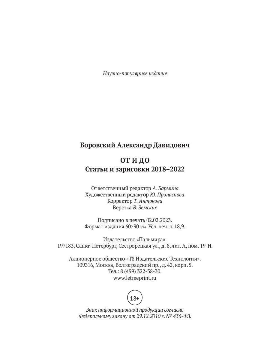 Handling time: 19 days Автор: Боровский Александр, «От и до. Статьи и зарисовки 2018–2022»: Александр Давидович Боровский (род. в 1952) — искусствовед, куратор, заведующий отделом новейших течений Государственного Русского музея. Окончил факультет теории и истории изобразительного искусства Института живописи, скульптуры и архитектуры им. И.Е. Репина. Член жюри премий «Инновация», «Премия Кандинского», «Премия Курёхина», «Ars Fennica». Автор более 400 работ по истории искусства XX века. В сборник «От и до» вошли избранные критические статьи, рецензии и очерки Александра Боровского о современном изобразительном искусстве. Тексты и зарисовки, написанные с 2018 по 2022 годы и расположенные в хронологическим порядке, предлагают острый искусствоведческий взгляд на события и тенденции в современной культуре и искусстве — тенденции, создающиеся на наших глазах.