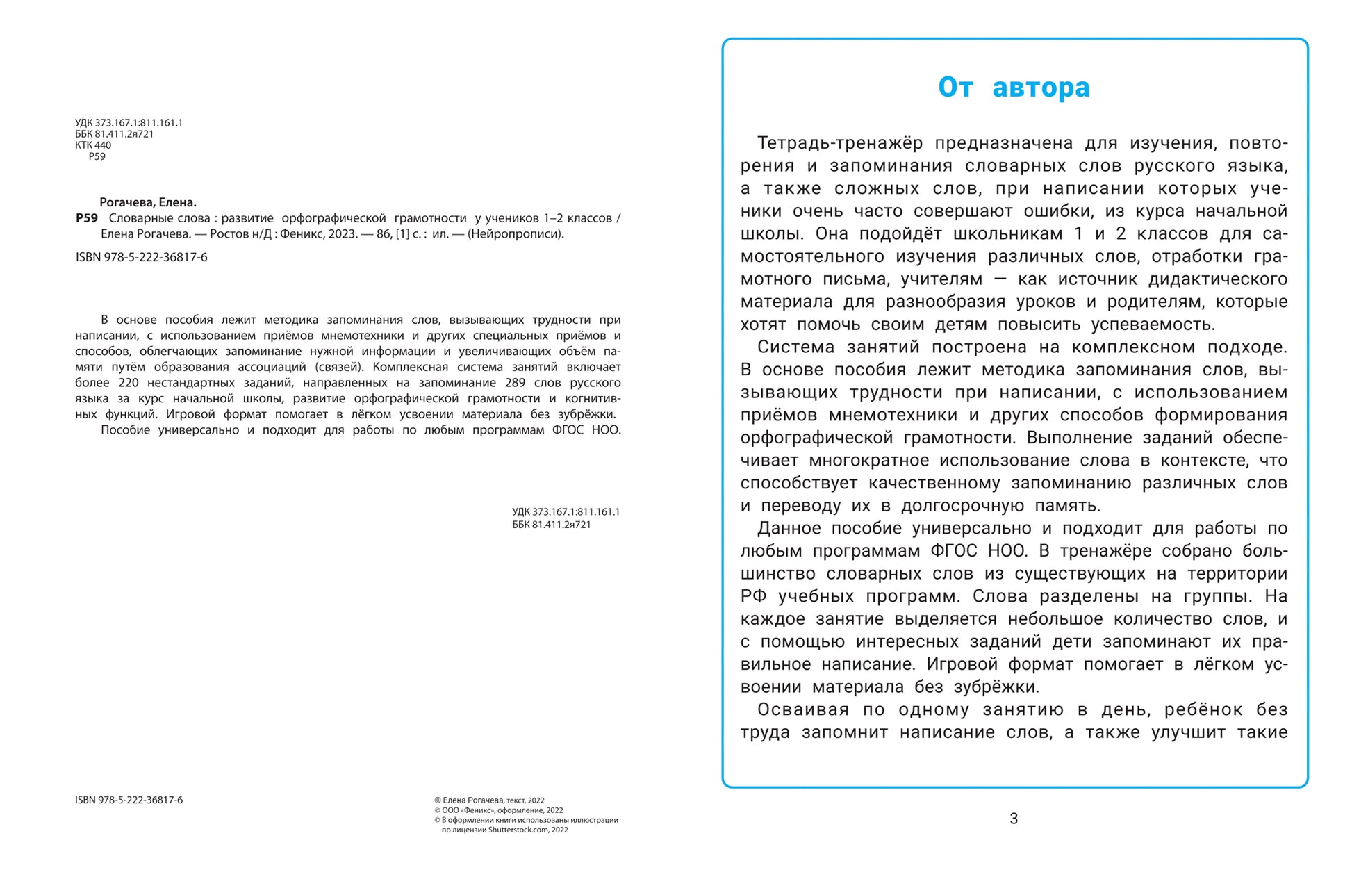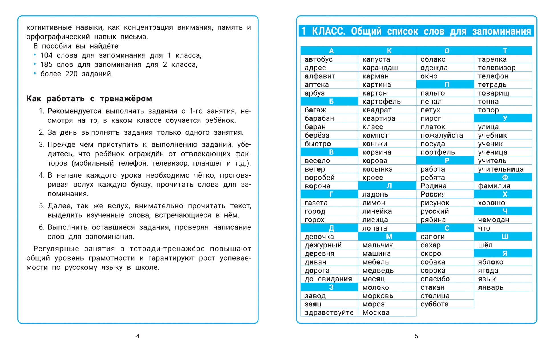 В основе пособия лежит методика запоминания слов, вызывающих трудности при написании, с использованием приёмов мнемотехники и других специальных приёмов и способов, облегчающих запоминание нужной информации и увеличивающих объём памяти путём образования ассоциаций (связей). Комплексная система занятий включает более 220 нестандартных заданий, направленных на запоминание 289 слов русского языка за курс начальной школы, развитие орфографической грамотности и когнитивных функций. Игровой формат помогает в лёгком усвоении материала без зубрёжки.